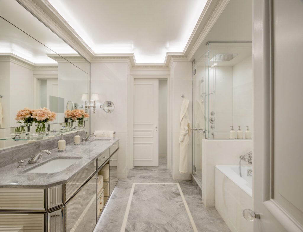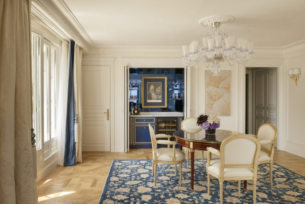 - La Suite Première : plus confidentielle, elle mise sur des volumes fluides et apaisés. Palette ivoire, vert d’eau et dorures patinées, œuvres de Gérard Redoules et détails en cristal Baccarat soulignent l’esprit d’un luxe discret et poétique.