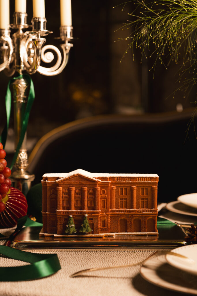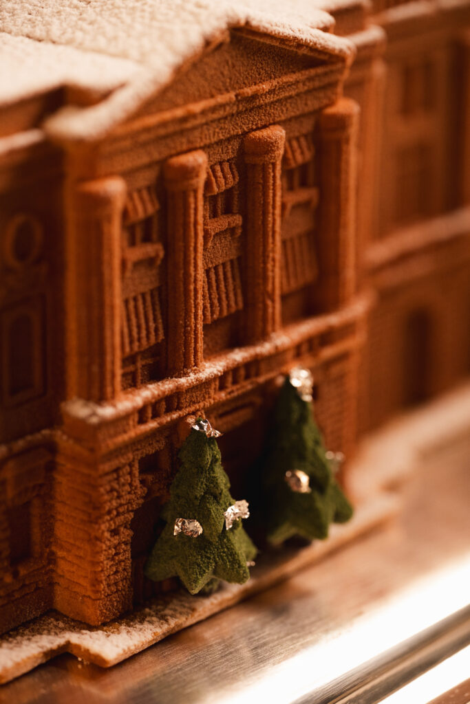 - Une bûche de Noël en forme de façade de l’Hôtel de Crillon : mousse vanille de Madagascar, croustillant praliné amande-spéculoos, compotée de pommes et biscuit moelleux, avec deux sapins en chocolat blanc. Prix : 110 € (6/8 personnes). Disponible en précommande dès le 10 novembre.
