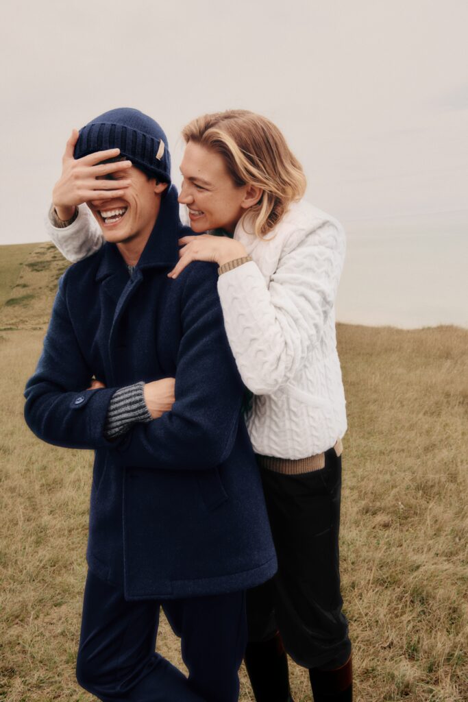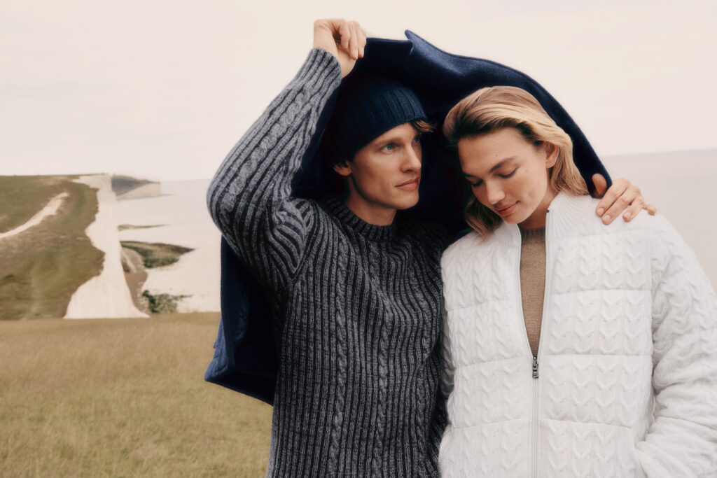La mise en scène du shooting, capturée sur les falaises blanches des Seven Sisters dans le Sussex, souligne cette philosophie. Là où la roche rencontre la mer, où le vert s’efface sous le bleu, Falconeri fait dialoguer deux univers : la rigueur minérale et la souplesse textile, l’épure italienne et la mélancolie britannique. L’image devient poème : l’homme et la femme Falconeri y incarnent une élégance vivante, ancrée dans la nature.