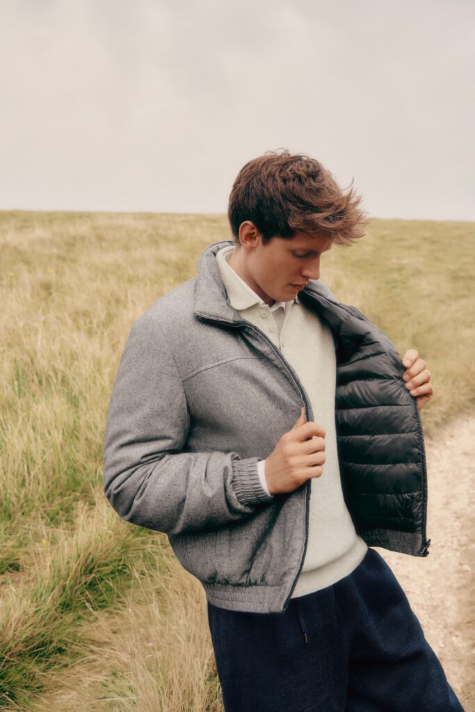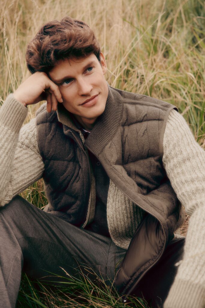 La collection met à l’honneur le cachemire dans ses expressions les plus fines. Les pièces se déclinent en tons chauds — beige amande, brun noisette, gris orage — tandis que les pulls à losanges Argyle rappellent l’héritage des vestiaires anglo-saxons. Pour la première fois, le pantalon en cachemire fait son apparition dans une version réversible : symbole d’un confort absolu et d’une masculinité nouvelle, douce et assurée.