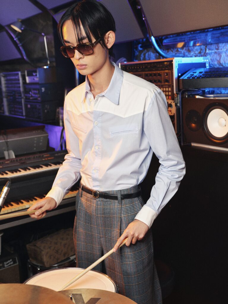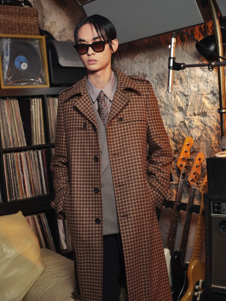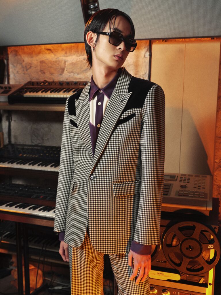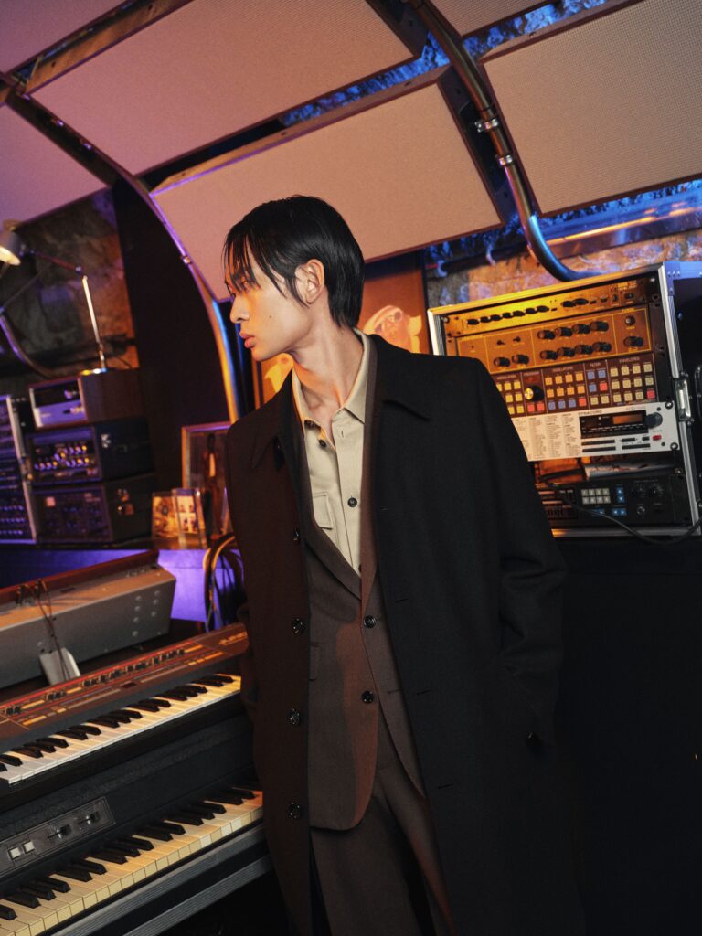 Les velours luxueux se mêlent à des laines fines pour des costumes trois-pièces d’une souplesse déconcertante. Les manteaux vichy brun, chemises dragon et pantalons à plis impeccables évoquent un raffinement à la fois classique et téméraire. Les teintes nocturnes de Tokyo – brun profond, gris encre, bleu nuit – habillent une silhouette ancrée dans la réalité urbaine tout en préservant une allure poétique.