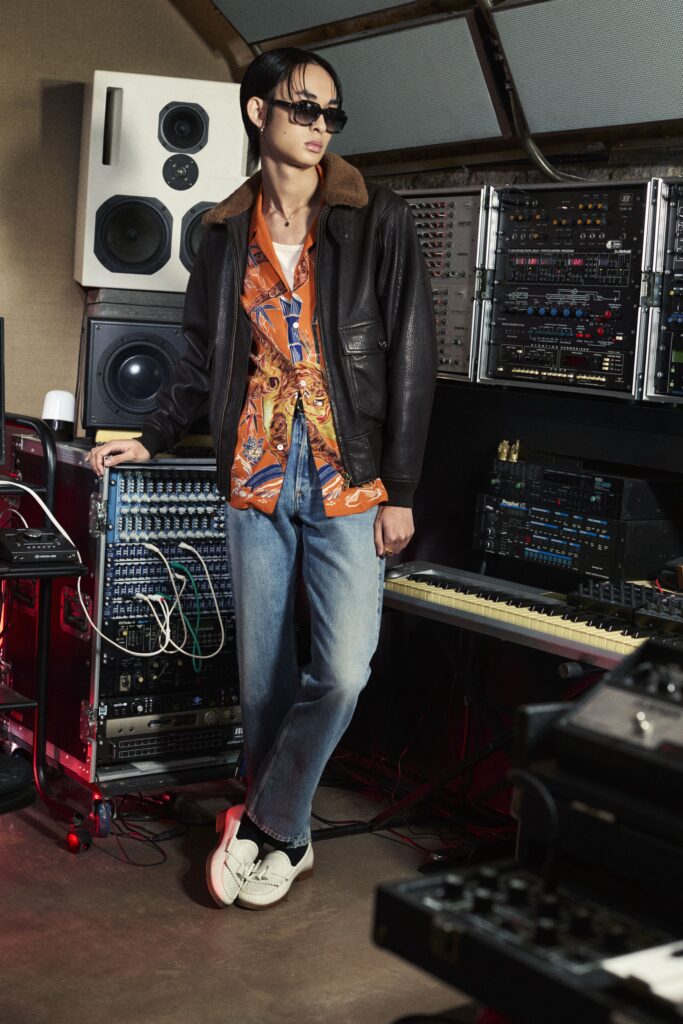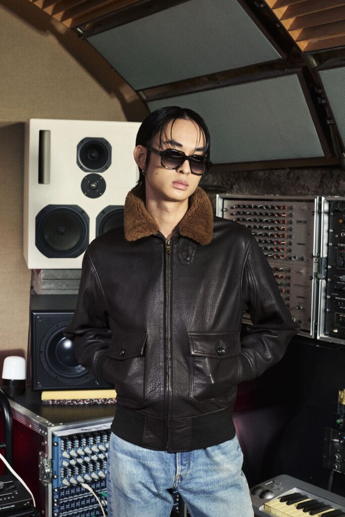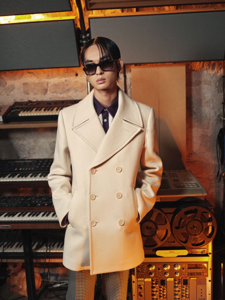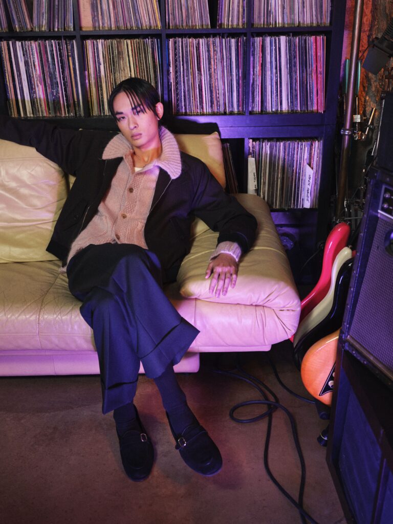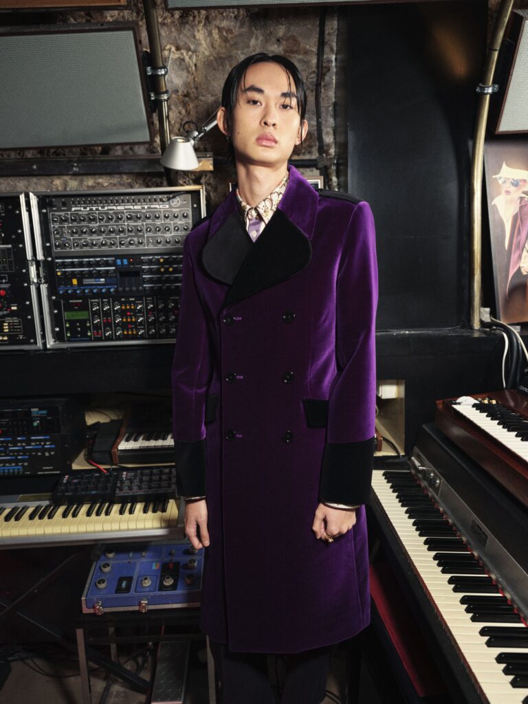 Les velours luxueux se mêlent à des laines fines pour des costumes trois-pièces d’une souplesse déconcertante. Les manteaux vichy brun, chemises dragon et pantalons à plis impeccables évoquent un raffinement à la fois classique et téméraire. Les teintes nocturnes de Tokyo – brun profond, gris encre, bleu nuit – habillent une silhouette ancrée dans la réalité urbaine tout en préservant une allure poétique.