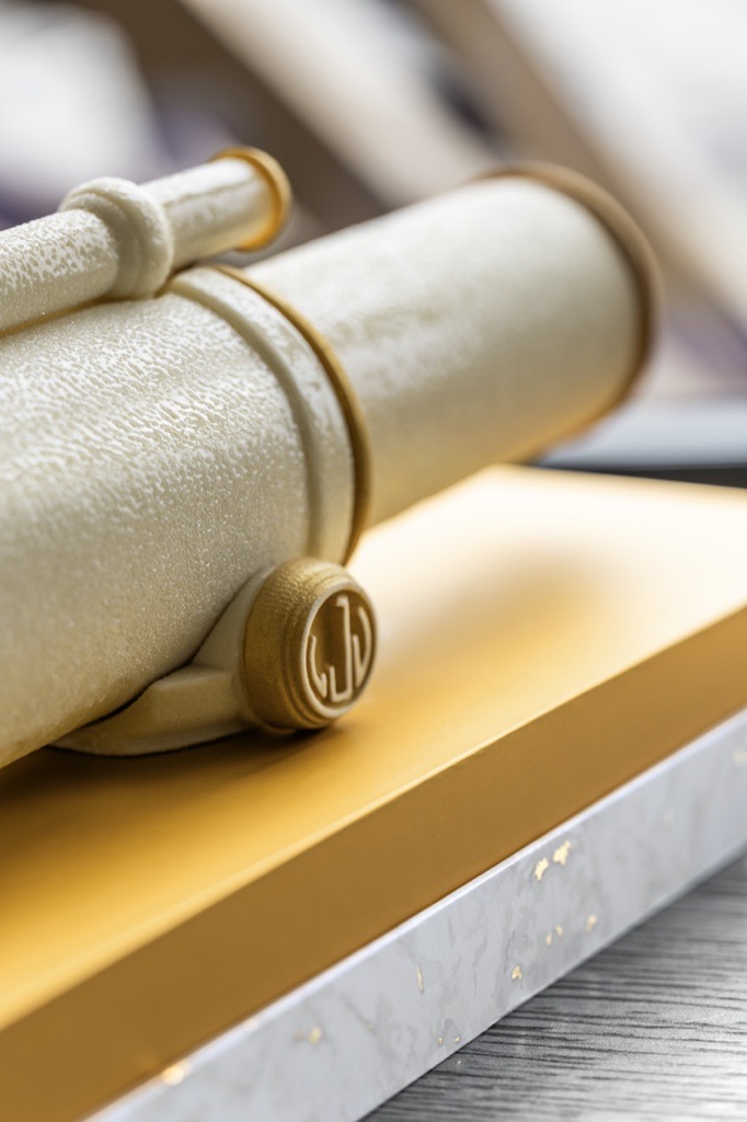 Tel un objet d’art posé sur son socle doré, Voyage Extraordinaire reprend les courbes précises et le fini métallisé des longues-vues emblématiques du second étage de la tour Eiffel. Réalisée en chocolat blanc velouté et en détails d’or comestible, la pièce conjugue architecture et poésie, promesse d’un Noël suspendu au-dessus de Paris.
