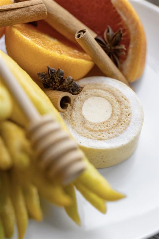 Sous la coque délicate au chocolat blanc, légèrement épicée et subtilement sucrée, se déploie un biscuit roulé imbibé d’un sirop à l’orange sanguine, enroulant un cœur crémeux aux agrumes vanillés et un confit de yuzu. Le tout est enveloppé d’une mousse légère infusée aux épices de Noël et au miel de châtaignier, équilibrée par un praliné croustillant aux zestes de bergamote. Une partition raffinée qui conjugue fraîcheur, douceur et caractère.