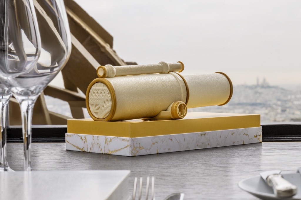 Suspendue entre ciel et terre, la magie du Jules Verne se savoure désormais jusqu’à la maison. Pour les fêtes 2025, le chef Frédéric Anton et le chef pâtissier Kévin Rabateaud dévoilent Voyage Extraordinaire, une création inspirée des célèbres lunettes d’observation de la tour Eiffel. Véritable prouesse d’artisanat sucré, cette bûche rend hommage au monument parisien et à l’élégance du restaurant doublement étoilé.