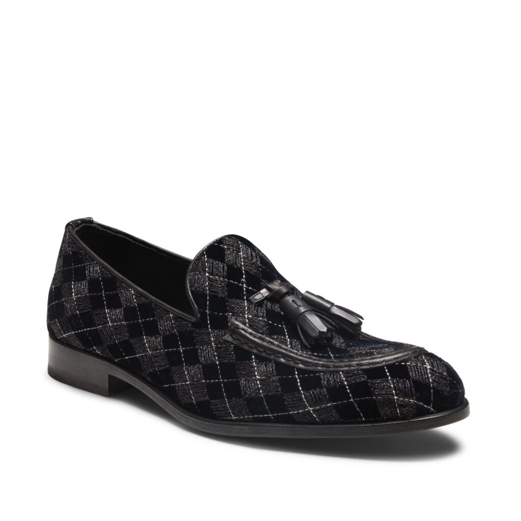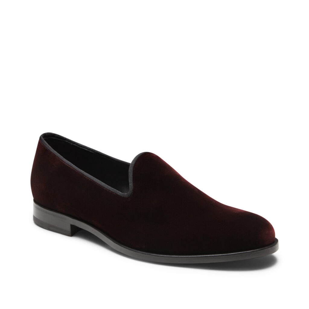 Pour lui, Fratelli Rossetti élève le mocassin au rang d’objet d’art. Le mocassin en velours anémone dévoile une silhouette d’une pureté absolue, subtilement soulignée de gros-grain noir. Ce modèle affirme la discrétion du luxe véritable : celui qui murmure plus qu’il ne montre. Mais la pièce maîtresse reste sans doute le mocassin Brera brodé, signature emblématique de la maison. Broderies géométriques et fils argentés s’y entremêlent, dessinant une lumière mouvante, presque vivante. Disponible pour homme et femme, il illustre à merveille le génie du détail, cette science italienne du “bello e ben fatto”.