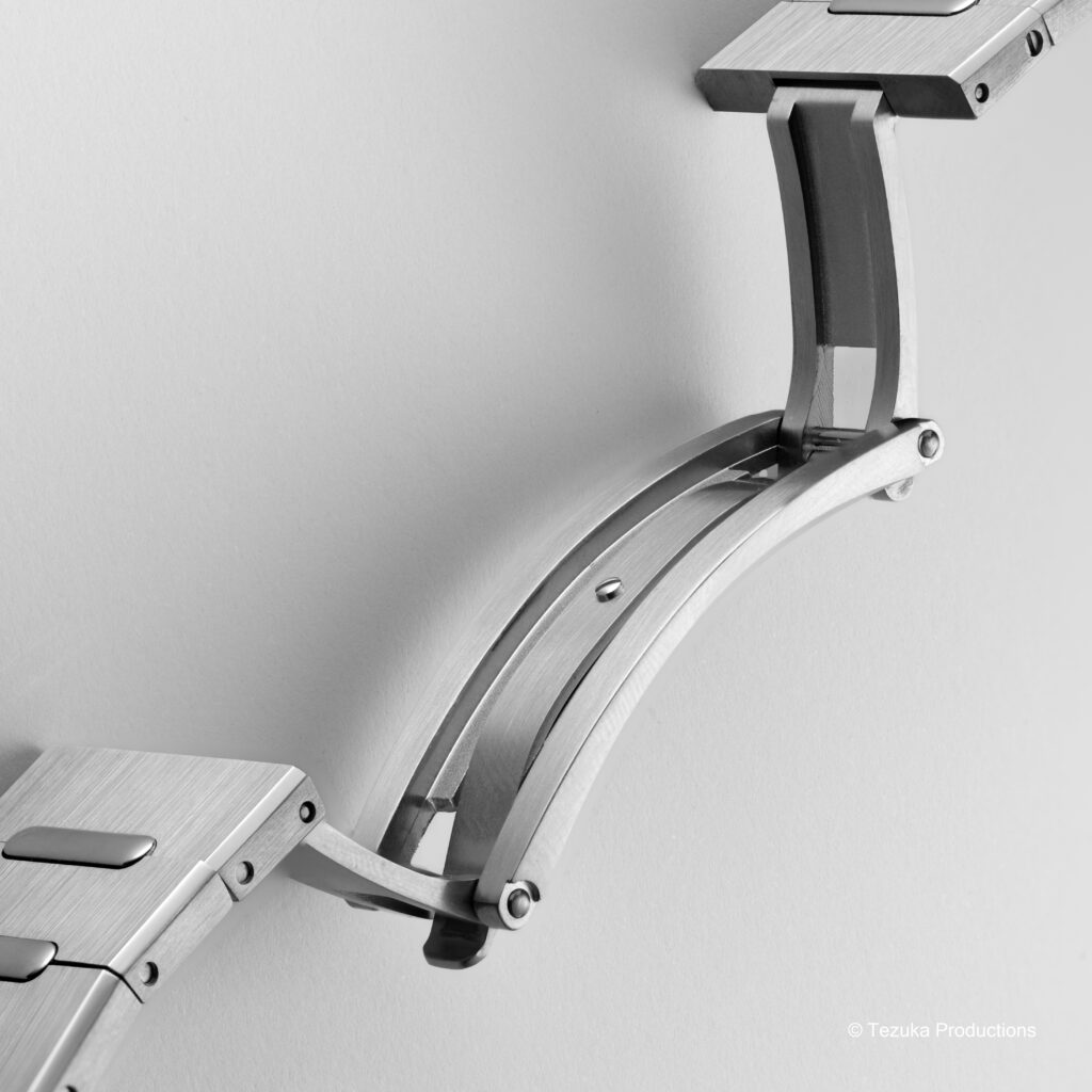 Le boîtier hybride de 40 mm de diamètre pour 8,95 mm d’épaisseur conjugue titane brossé pour la carrure et acier poli pour la lunette, la couronne et les cornes. Ce contraste de matériaux et de finitions, fruit de trois années de développement selon la manufacture, vise à alléger le poids total tout en préservant une présence visuelle affirmée au poignet. Le bracelet intégré bi-matière, également en titane brossé et acier poli, constitue une première dans l’histoire de la marque fondée en 1929.
