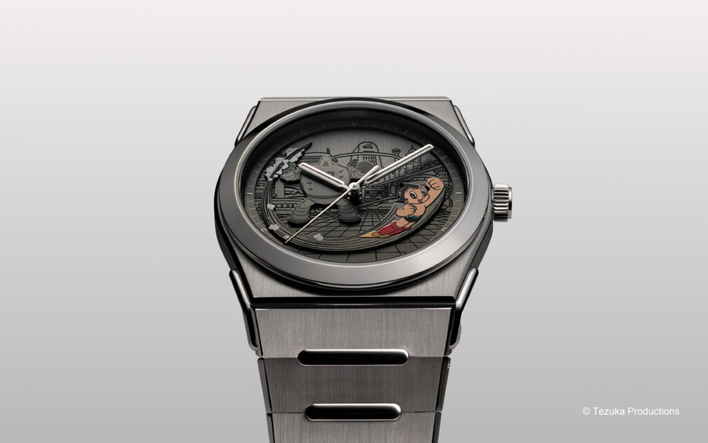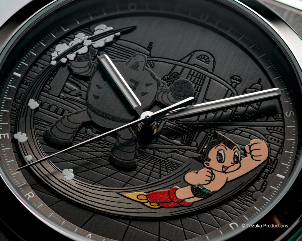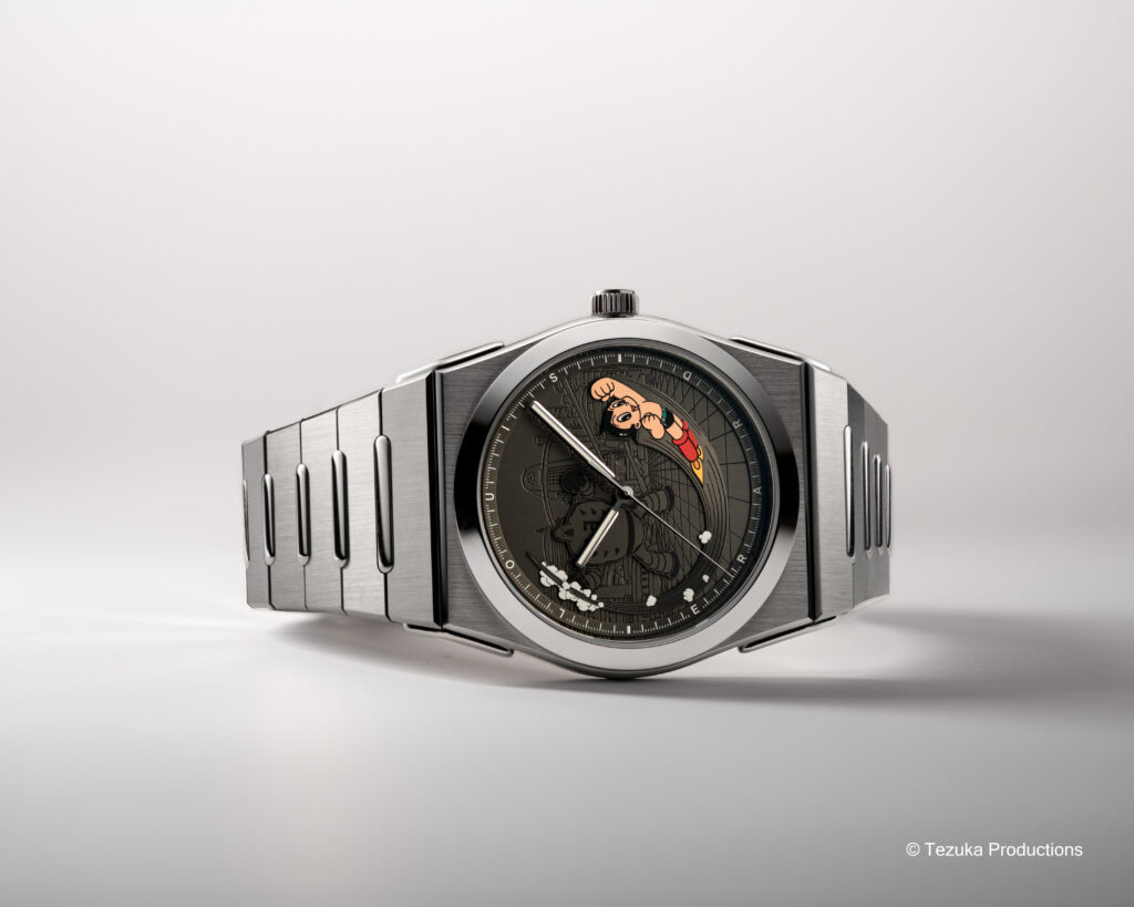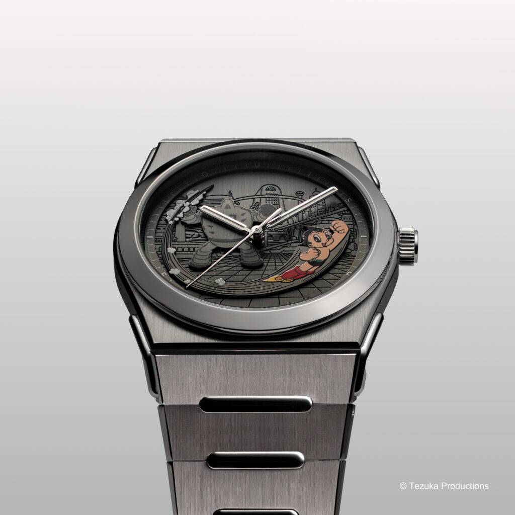 L’exercice technique mérite l’attention. Le cadran de cette édition spéciale ne se contente pas d’un simple transfert sérigraphique : Astro Boy est appliqué en volume, avec une construction à trois niveaux superposés. La base du cadran présente une gravure verticale satinée évoquant Metro City, la mégalopole futuriste de l’univers narratif d’Astro Boy. Sur cette toile urbaine, le personnage principal surgit en couleur, accompagné d’un panache de fumée suggérant le mouvement ascendant. Un vilain iconique de la série se dessine en arrière-plan, traité en noir mat pour renforcer le contraste dramatique. Le rehaut circulaire surélevé, imprimé d’une minuterie blanche et rehaussé de Super-LumiNova SLN-C1 à émission bleue, encadre cette scène cinématographique.
