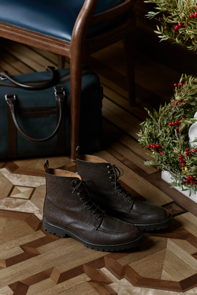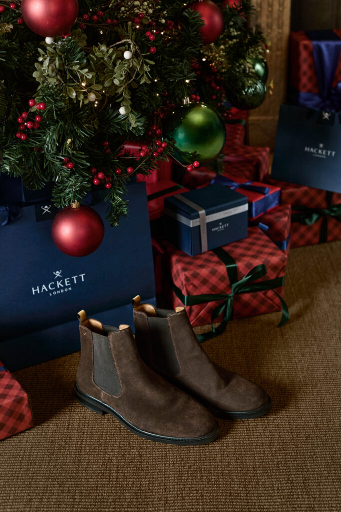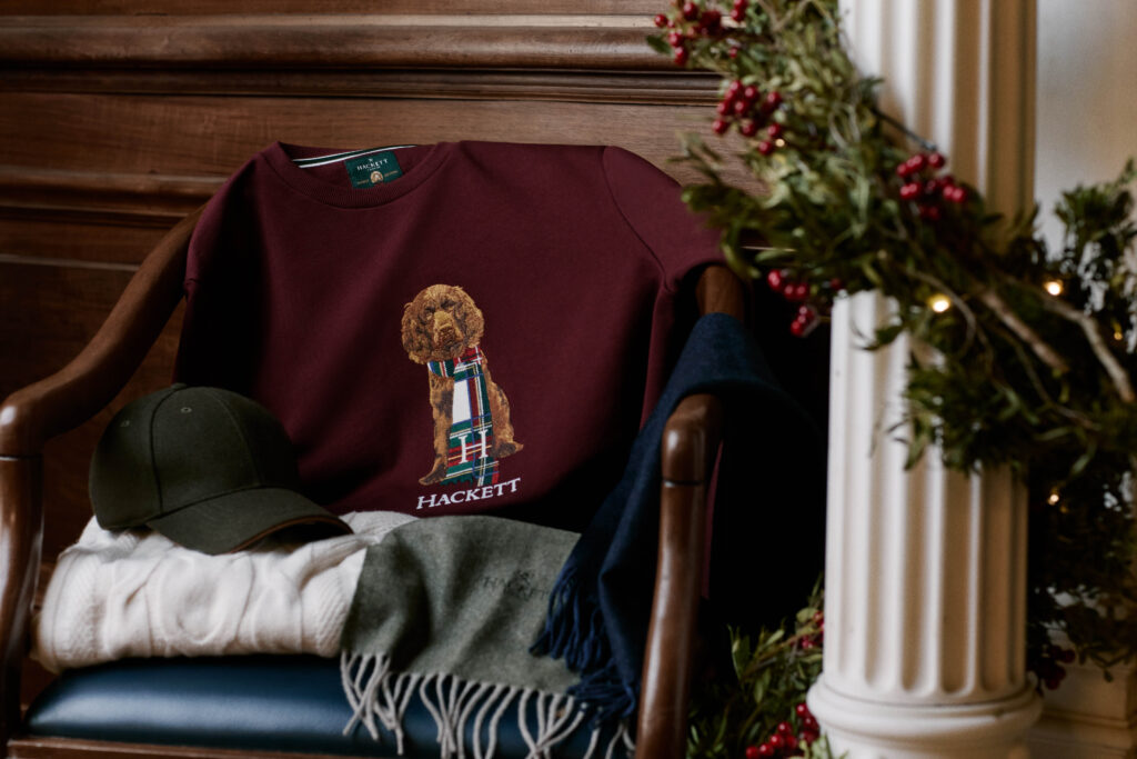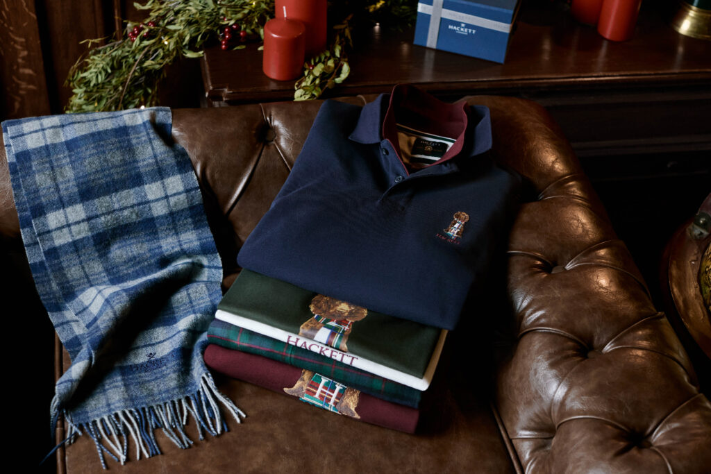 Côté accessoires, Hackett mise sur des valeurs sûres : cravates en soie mélangée aux motifs discrets (75 €), Chelsea boots élégantes (250 €), baskets Keston (110 €) ou encore le pyjama en flanelle Harry Edition (159 €), clin d’œil raffiné à l’art de vivre domestique.