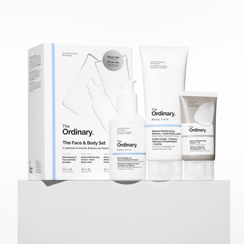 Le Face & Body Set poursuit cette logique de décloisonnement des usages. Ici, The Ordinary rappelle que la peau ne s’arrête pas au visage. L’émulsion visage et corps à 5 % de niacinamide (100 mL) dialogue avec deux versions des Facteurs Naturels d’Hydratation — l’une enrichie en inuline, l’autre en acide hyaluronique — pour composer une routine complète, modulaire, applicable selon les besoins et les zones. À 19,90 €, ce coffret incarne une vision rationnelle du soin global, en phase avec une consommation plus consciente et moins fragmentée.