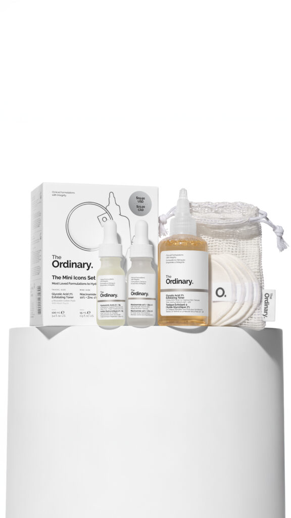 Pensé pour les voyageurs et les adeptes de routines minimalistes, le Mini Icons Set condense l’ADN de la marque. Le tonique exfoliant à l’acide glycolique 7 % en format 100 mL s’accompagne de cotons réutilisables et d’une pochette en mesh, soulignant l’attention croissante portée aux gestes durables. Les sérums Niacinamide 10 % + Zinc 1 % et Acide Hyaluronique 2 % + B5, tous deux en 15 mL, complètent ce trio culte. À 20,60 €, ce set agit comme une synthèse pédagogique de l’approche The Ordinary.