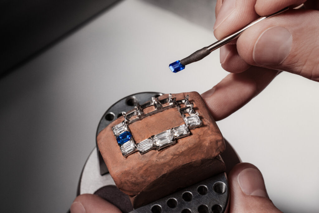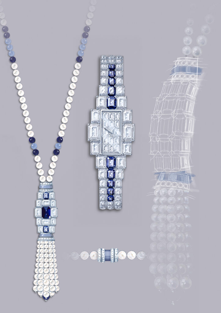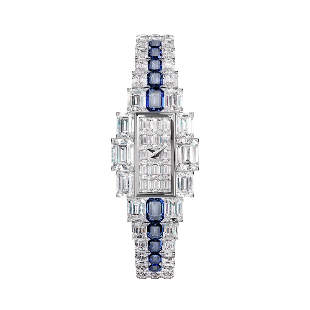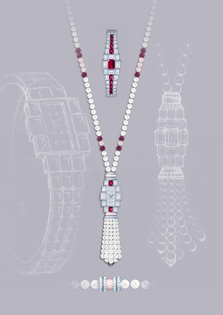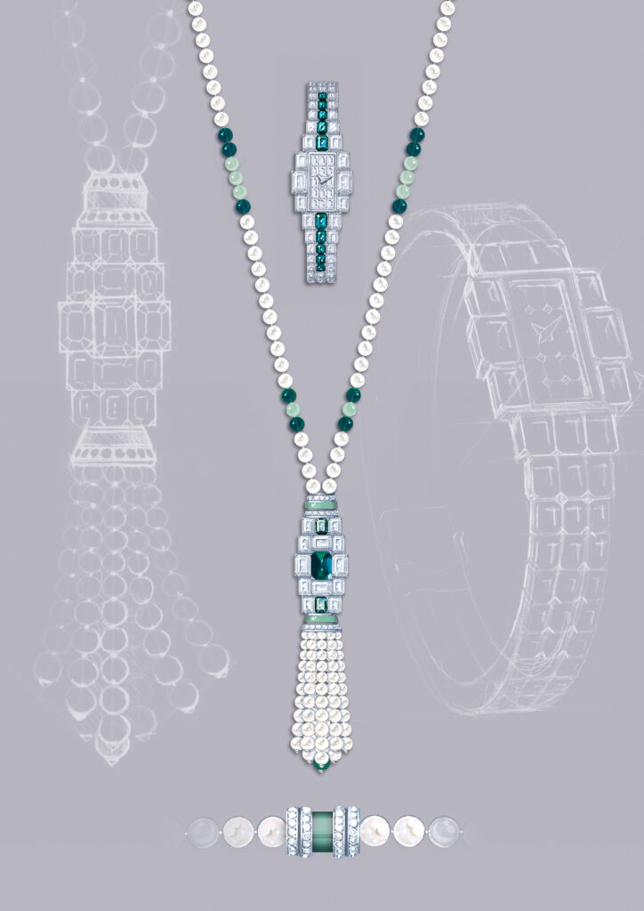 Cette filiation Art déco se manifeste dans la géométrie rectiligne du bracelet et du boîtier, contrastant avec la grâce sinueuse du sautoir. Donguy insiste sur le rôle structurant des pierres précieuses : « Sur les montres joaillières créées par la Maison à partir des années 1920, les gemmes font partie intégrante du design. Les boîtiers, volontairement discrets, servent d’écrin au sertissage des pierres qui gagnent tout leur éclat. » Cette philosophie inverse la hiérarchie traditionnelle horlogerie-joaillerie : le mouvement devient support d’une expression gemmologique plutôt que finalité technique.