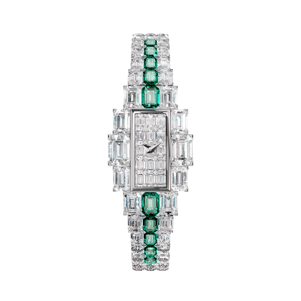 Le bracelet rivière à trois rangs compte 103 diamants taille émeraude pour environ 23,26 carats, dont une rangée centrale ornée de huit pierres précieuses de couleur. Le boîtier de 19,4 mm x 30,1 mm x 8,3 mm abrite le calibre 1212, mouvement quartz de 11,3 mm de diamètre développé par Vacheron Constantin, comprenant 85 composants et six rubis synthétiques pour un total de six carats. Le cadran, entièrement pavé de 14 diamants taille émeraude (environ 1,54 carat), ne porte aucun index appliqué : deux gemmes de couleur taille émeraude contrastent avec les dix diamants pour former une corolle délicate. Les aiguilles en or blanc 18 carats ou or blanc 19 carats (selon la version platine ou or) adoptent un profil squelette pour ne pas obstruer la lecture.