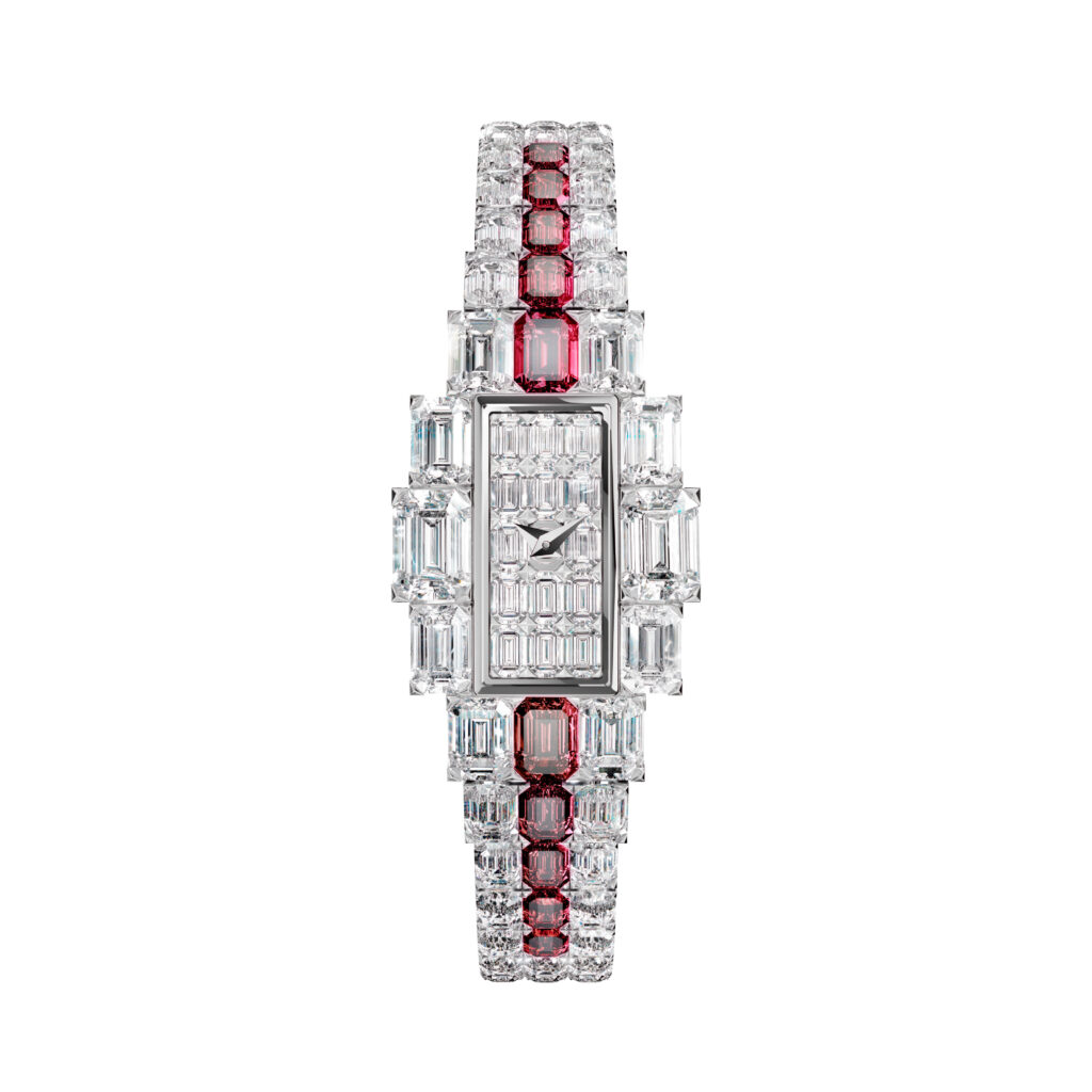 La Grand Lady Kalla de 2024 radicalise cette évolution en dissociant fonctionnellement la montre du bijou : le boîtier horloger devient interchangeable avec une pièce joaillière strictement ornementale, tous deux montables sur bracelet ou sur sautoir. Cette modularité, déjà présente en filigrane dans l’histoire des montres-pendentifs féminines de la Belle Époque, trouve ici une expression contemporaine sophistiquée. Les trois versions désormais disponibles — saphir, rubis, émeraude — étendent la palette chromatique tout en préservant l’architecture Art déco de l’ensemble : géométrie rectiligne du bracelet et du boîtier, grâce sinueuse du sautoir de 85 centimètres.