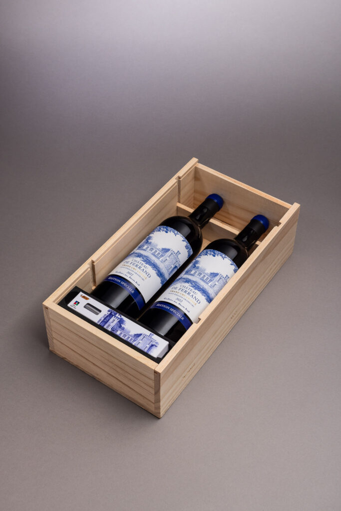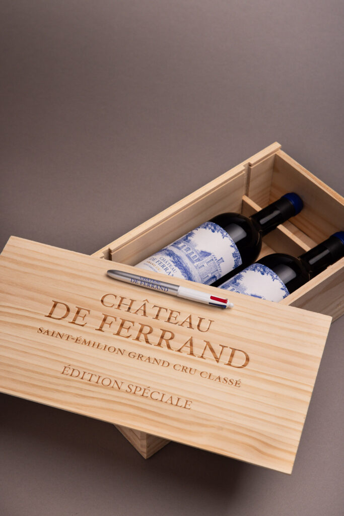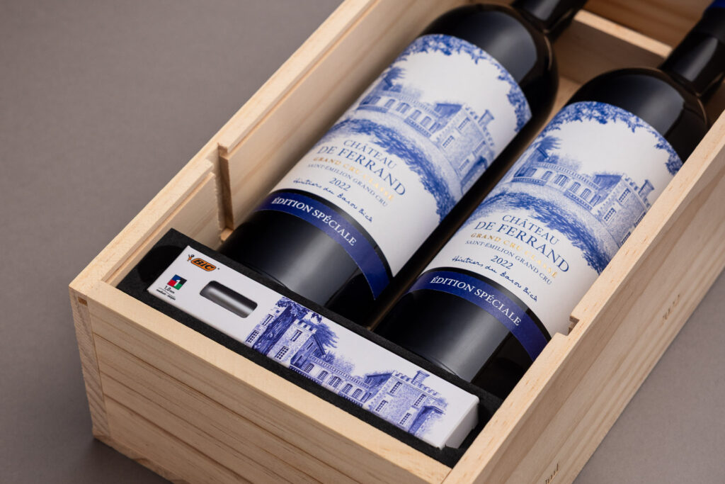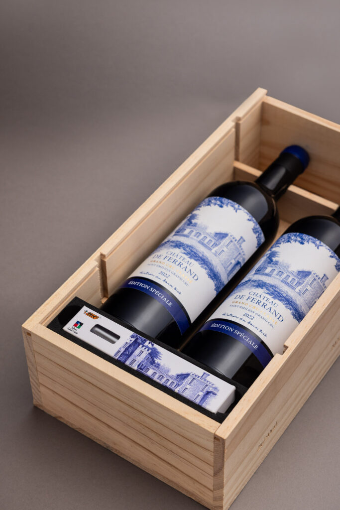Ce coffret « Édition Spéciale » réunit deux bouteilles du millésime 2022, présentées en avant-première sous la nouvelle étiquette de la propriété. Un choix stratégique, à forte charge symbolique : cette illustration au stylo BIC® 4 Couleurs, réalisée à la main, s’inspire de la collection d’art contemporain du domaine. Elle établit un pont assumé entre le patrimoine culturel de Ferrand et son inscription dans la modernité. Une identité visuelle repensée, donc, mais qui reste fidèle à l’ADN du lieu : rigueur, discrétion, transmission.