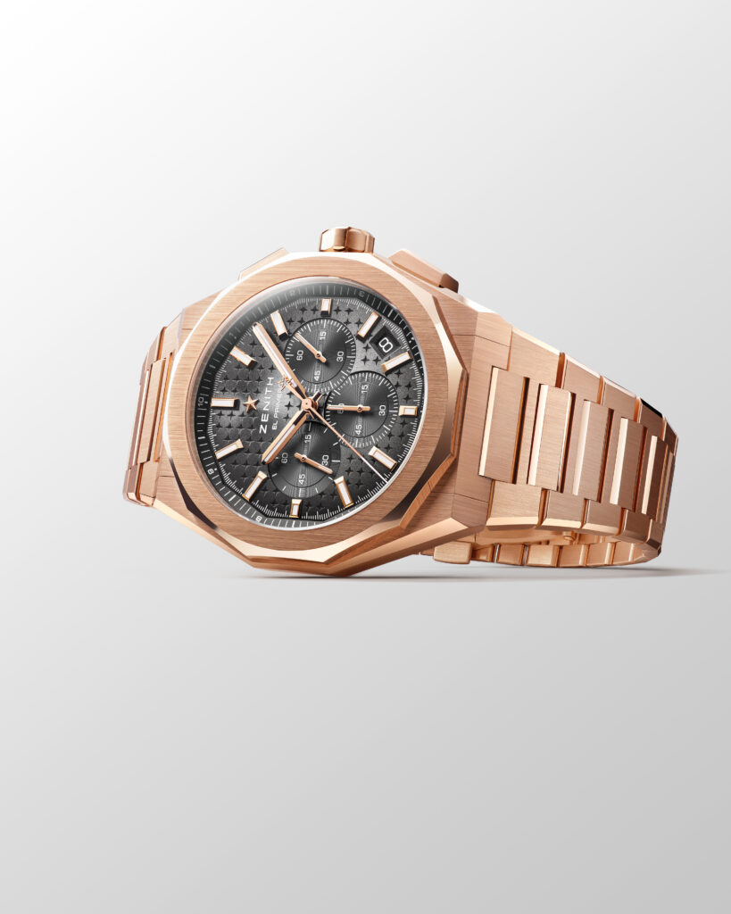 La collection explore également les nuances de l’or rose, mariées à des complications de haute voltige. Le DEFY Skyline Chronograph (42 mm) associe l’or rose à un cadran dégradé gris ardoise orné du motif « ciel étoilé ». Sous le capot, le calibre El Primero 3600 bat à 5 Hz, offrant une lecture dynamique du temps où la trotteuse effectue une rotation complète en dix secondes.