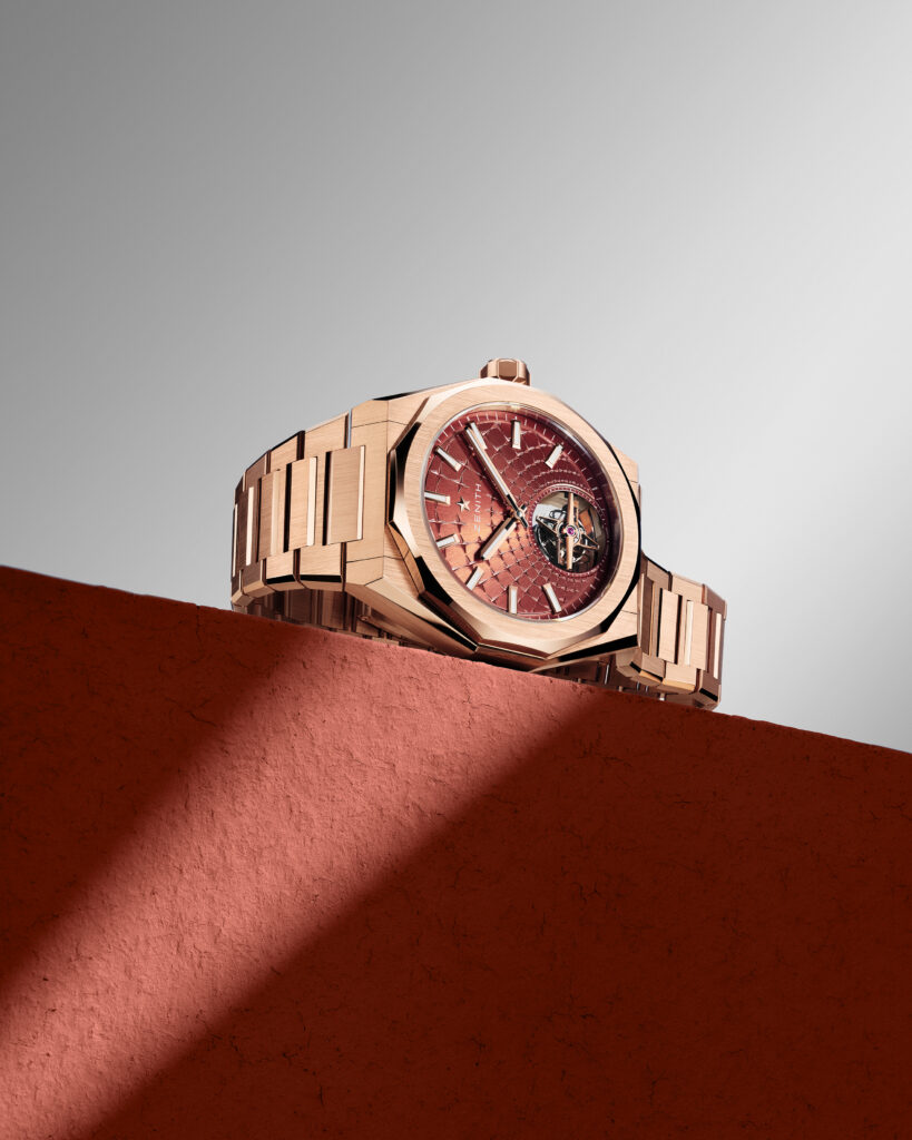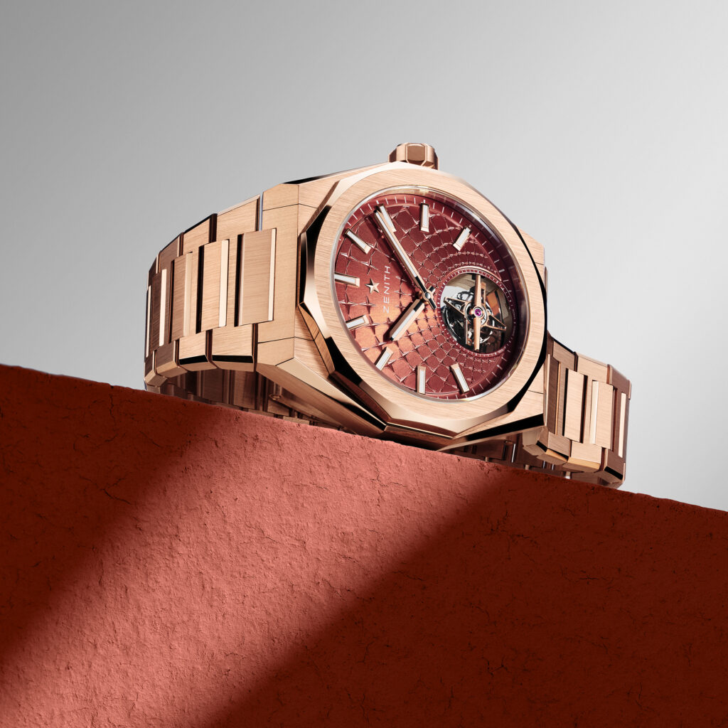 Enfin, l’apogée de cette série est sans conteste la DEFY Skyline Tourbillon. Pour la première fois entièrement réalisée en or rose, elle arbore un cadran rouge brique dont le motif rayonnant rend hommage à l’architecture historique de la Manufacture au Locle. La cage du tourbillon, en forme d’étoile, effectue une rotation hypnotique par minute, rappelant que chez ZENITH, la technique est toujours au service de l’émotion.