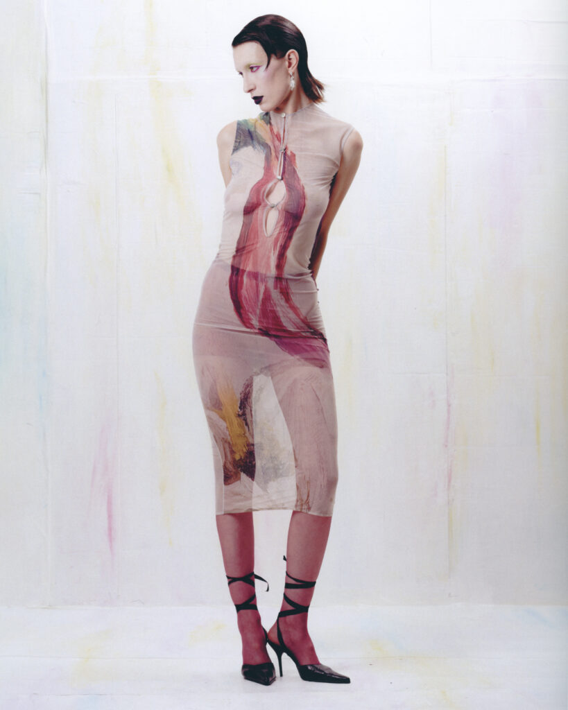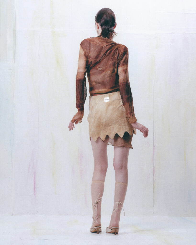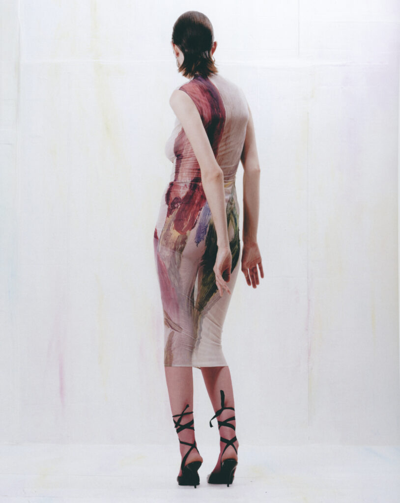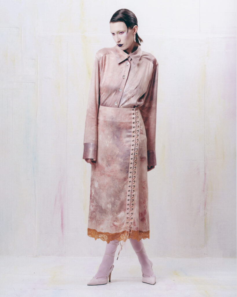 Le look phare — un ensemble peint à la main, composé d’une veste courte structurée et d’une mini-jupe à double laçage — condense tout l’esprit de Rappaz : artisanal, tactile, et viscéralement contemporain. Les tons de nude, de crème, de rose fumé et de vermillon évoquent les toiles de l’artiste américaine, mais surtout la peau, la sève, la matière vivante.