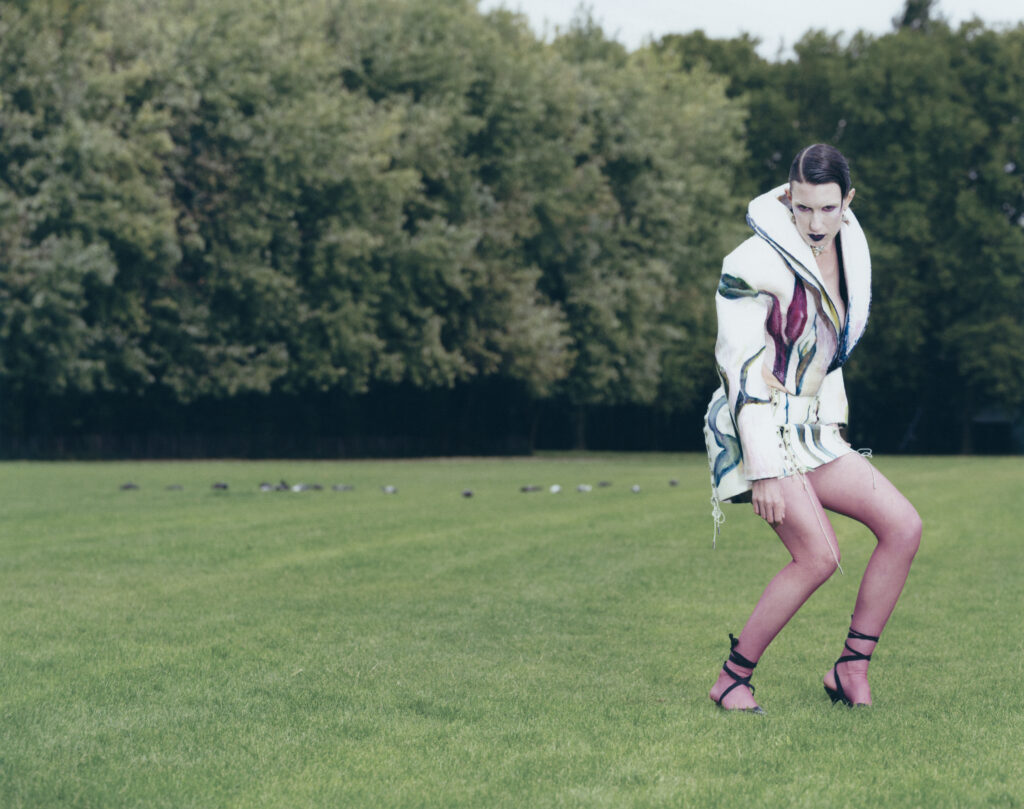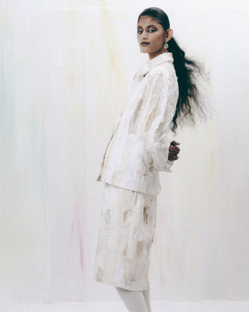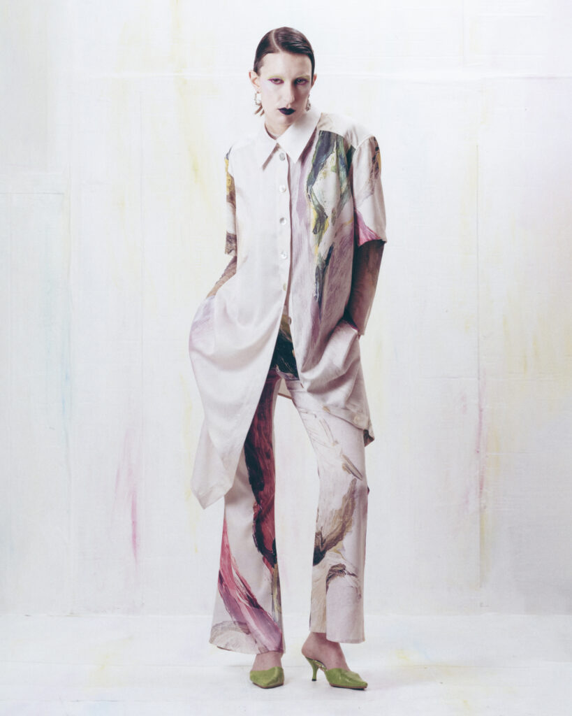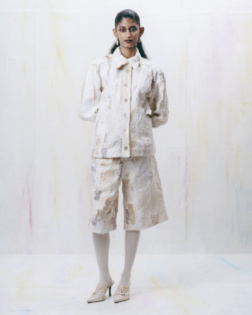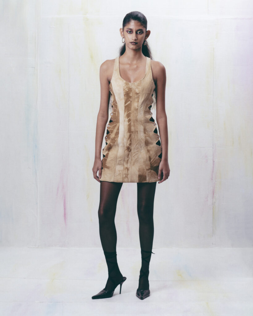 Le look phare — un ensemble peint à la main, composé d’une veste courte structurée et d’une mini-jupe à double laçage — condense tout l’esprit de Rappaz : artisanal, tactile, et viscéralement contemporain. Les tons de nude, de crème, de rose fumé et de vermillon évoquent les toiles de l’artiste américaine, mais surtout la peau, la sève, la matière vivante.