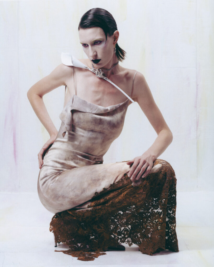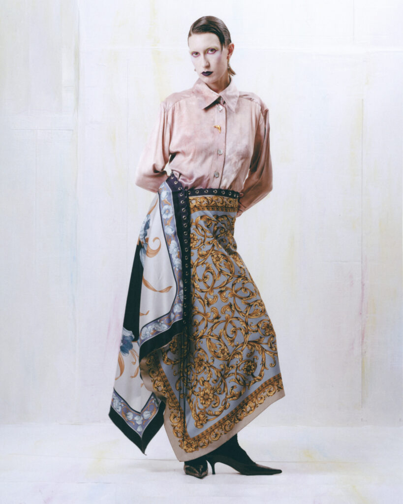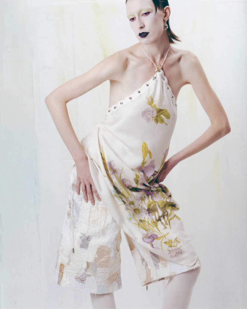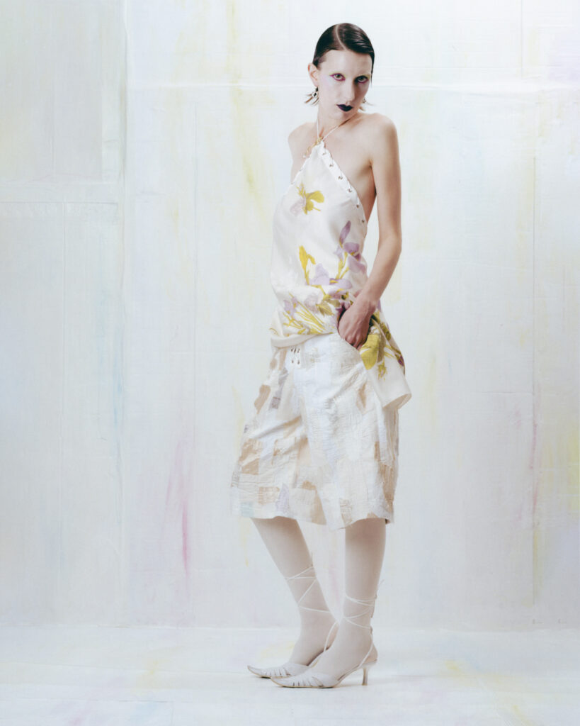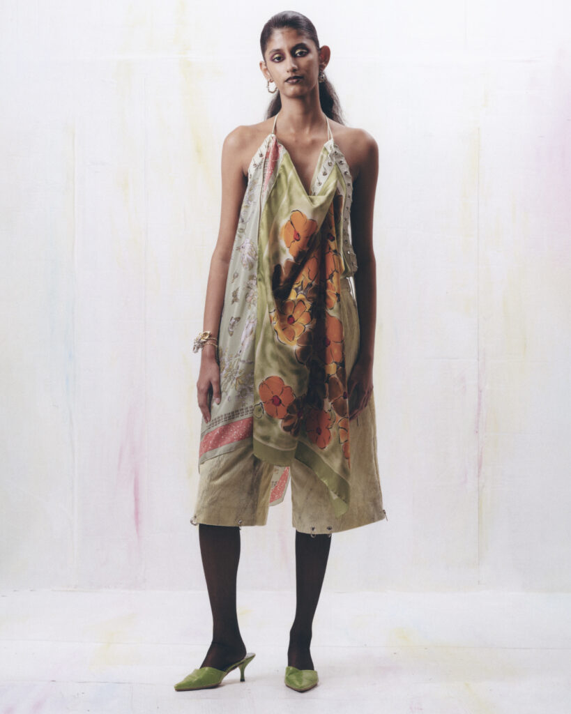 Sous cette apparente délicatesse, une énergie punk affleure : coutures franches, dentelles anciennes réinventées, foulards vintage détournés. L’upcycling, déjà signature de la maison, n’est pas un geste décoratif mais un acte d’équilibre : transformer sans effacer, sublimer sans dompter.