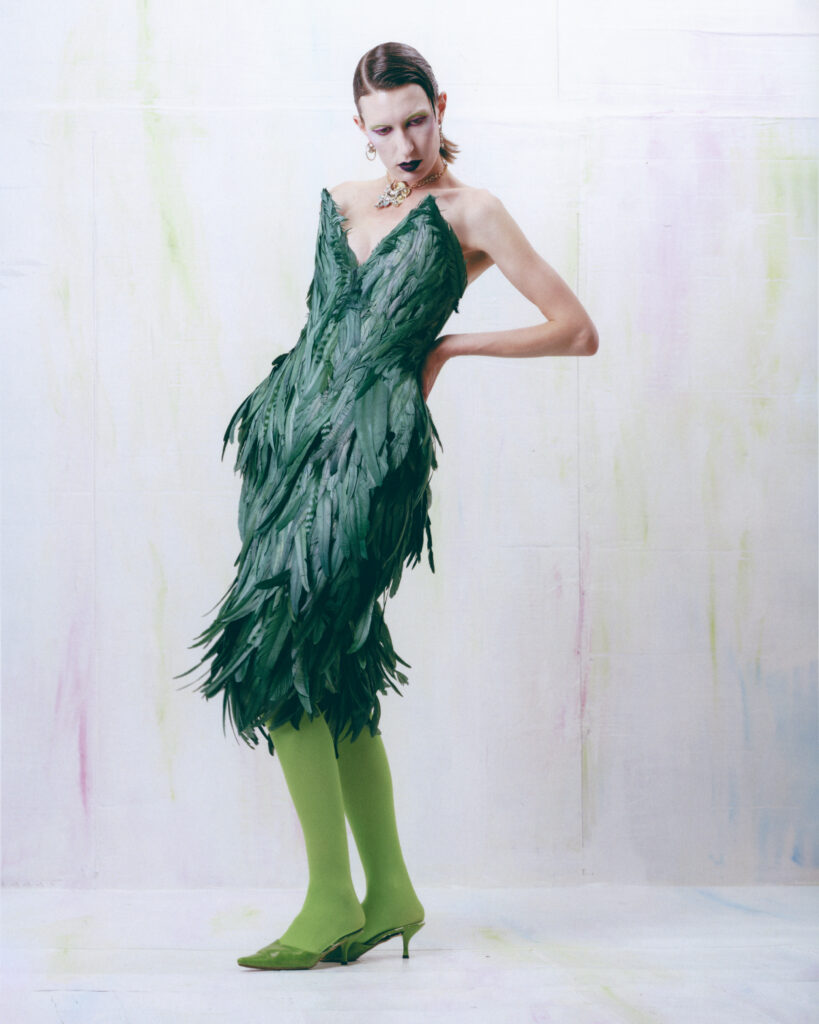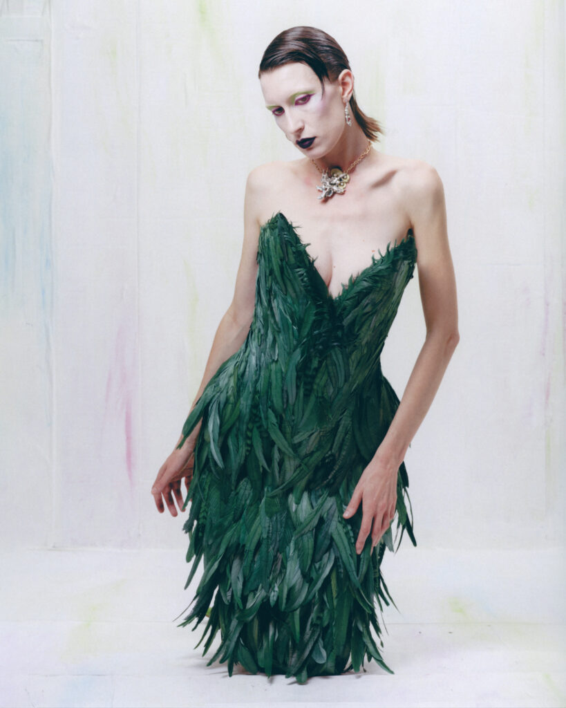 L’arum, à la fois pur et charnel, devient ici le fil conducteur d’un récit textile où les lignes se fondent comme des pétales, oscillant entre la douceur du satin et la tension du cuir. Les silhouettes glissent entre fluidité et structure, avec des robes diaphanes, des tailleurs au tombé architectural et un corset recouvert de plumes, presque animal. Chaque pièce s’apparente à une étude botanique, à la fois précise et libre.