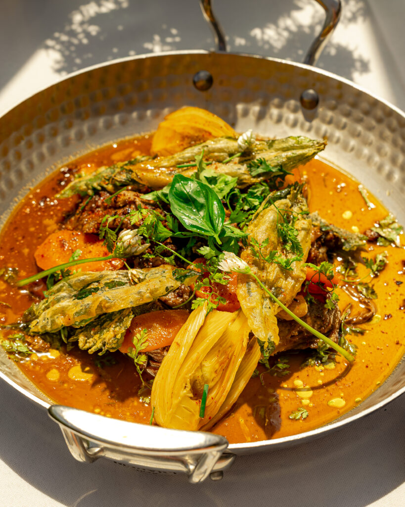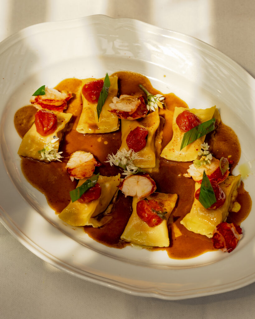 Pour ceux qui conçoivent le repas comme un acte de communion, le Menu Tropezina (89 euros par personne, conçu pour deux) célèbre le partage. C’est ici que s’exprime toute la générosité provençale revisitée par Piège. On y retrouve la signature du lieu avec la salade de homard Jardin Tropezina, suivie d’une plancha de loup accompagnée d’une barigoule d’artichauts, véritable hymne au terroir local. Le festin se clôt sur une note iconique avec la fameuse tarte « Tropégienne », clin d’œil sucré au mythe de Saint-Tropez.