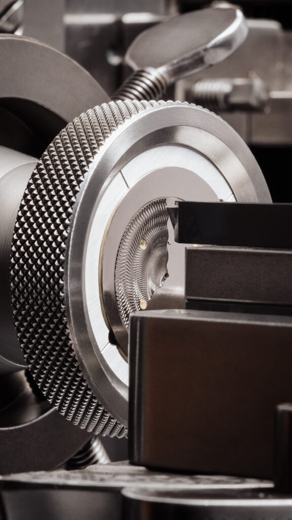 La gravure en taille douce transforme les flancs du boîtier en théâtre cosmique. Côté couronne, un soleil darde ses rayons à travers les nuages vers la Terre, tandis que la carrure opposée révèle les planètes vues depuis la Lune. Les incisions, variant de 1/10e à 5/10e de millimètre, créent des reliefs subtils où surfaces polies et ciselées alternent pour accentuer la profondeur du panorama. Le guillochage rayonnant du cadran, réalisé manuellement sur tour traditionnel et teinté PVD bleu, évoque l’immensité stellaire tout en dialoguant avec le liseré opalin noir des compteurs.
