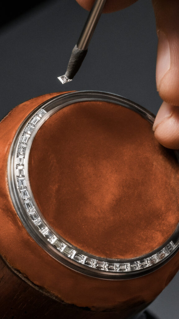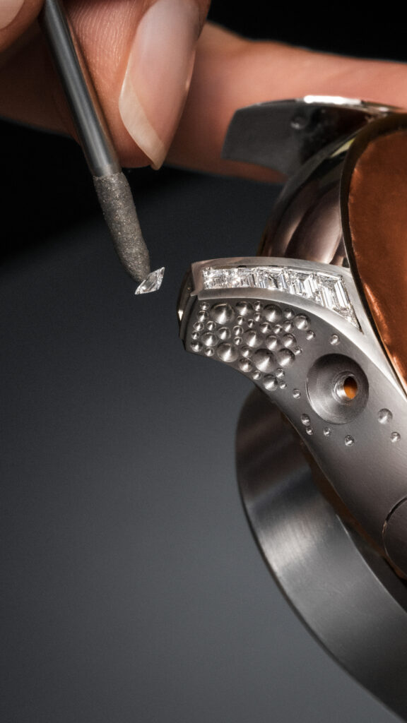 La dimension joaillière transcende l’ornement pour devenir narration cosmique. Le sertissage combine deux techniques distinctes : un sertissage rail de diamants baguette sur les surfaces planes – lunette sur deux rangs, fond de boîte, cornes et boucle déployante – et un serti neige parsemant la carrure de diamants taille brillant de neuf diamètres différents, de 0,7 à 2 millimètres. Cette « poussière de lune » qui donne son nom à la pièce évoque les particules cosmiques flottant dans l’espace intersidéral. Au total, 200 diamants taille baguette (environ 9 carats) et 165 diamants taille brillant (0,92 carat) requièrent 230 heures de sertissage minutieux.