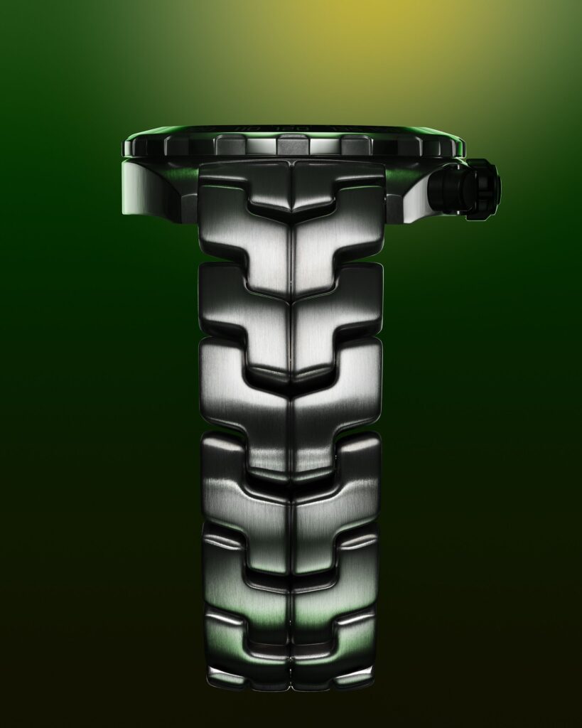 Sous cette allure racée, bat un cœur d’une redoutable exactitude : le mouvement chronographe à quartz de haute précision, conçu pour mesurer les exploits avec la rigueur d’un tour de piste. Trois compteurs équilibrent le cadran, rappelant la symétrie parfaite du cockpit d’une Formule 1. L’ensemble est protégé par un boîtier de 43 mm en acier satiné et une lunette fixe en céramique noire, gravée de l’échelle tachymétrique “SENNA”.