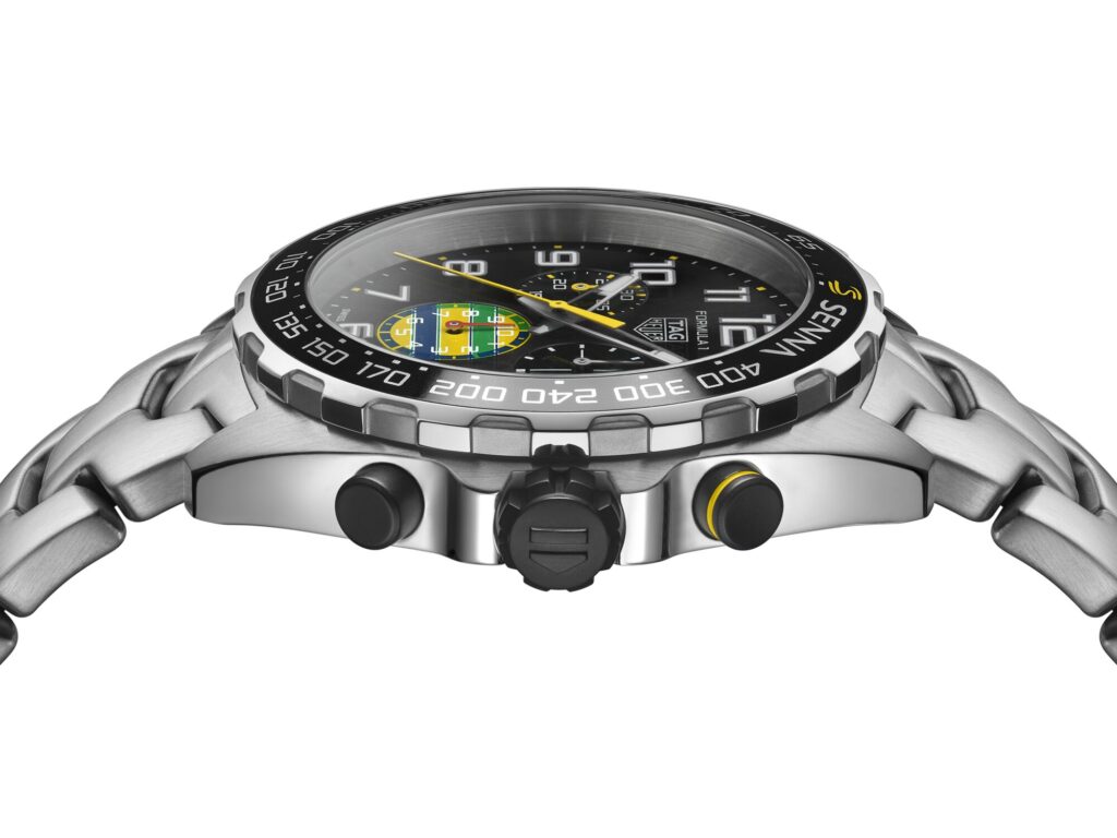 Dès le premier regard, l’influence du triple champion du monde se manifeste : le bracelet S-Link en acier poli, reconnaissable entre tous, évoque les montres que Senna portait dans les années 1990. Sa construction ergonomique épouse le poignet avec la même précision qu’une monoplace épouse l’asphalte. Sur le cadran anthracite brossé, le “S” stylisé — emblème de Senna — apparaît en touches subtiles de jaune, sa couleur fétiche, symbole de vitesse et d’optimisme.