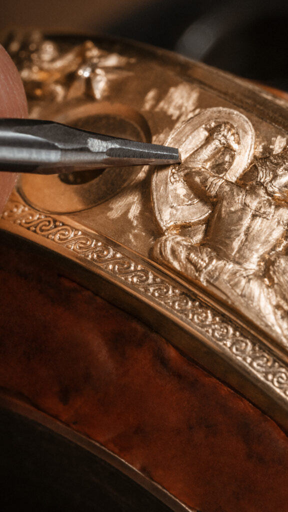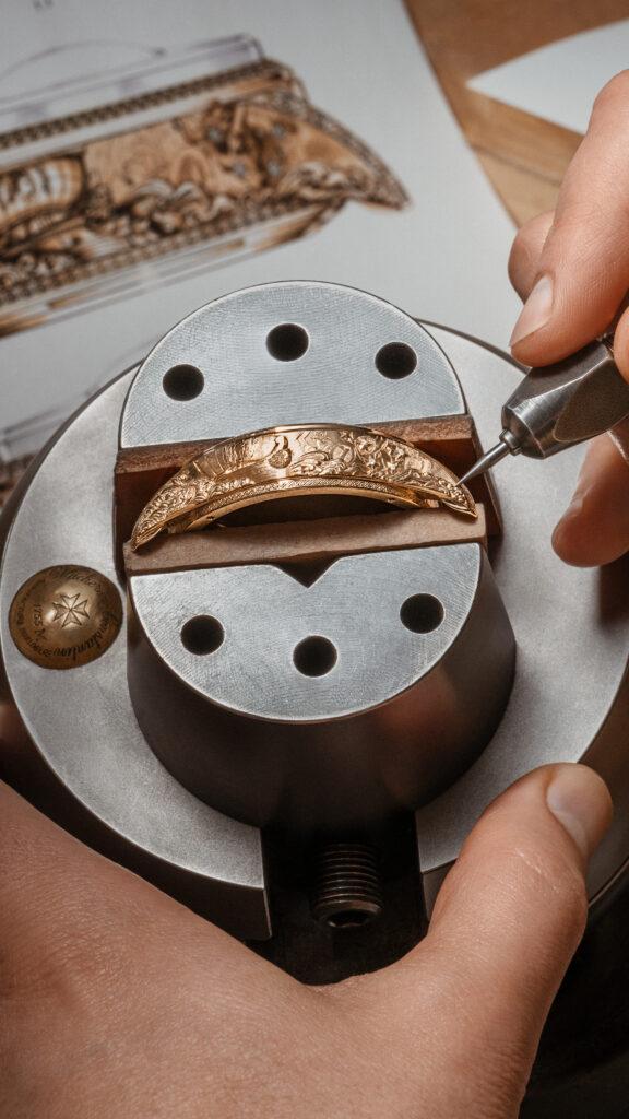La réalisation de ces compositions commence par un dessin à la pointe sèche traçant les contours des silhouettes, étoiles et nuages, travail d’une minutie extrême compte tenu de la profusion de détails. Le graveur fait ensuite ressortir les volumes au burin par enlèvement de matière, en veillant à ne pas excéder 1 millimètre d’incision sur la carrure. La micro-sculpture confère leur aspect définitif au chasseur Orion, au taureau et aux créatures marines. Les burins sont taillés à plusieurs reprises pour atteindre le niveau de précision exigé par ces compositions. Le graveur fait ressortir du décor le bouclier d’Orion ainsi que les pattes et cornes du taureau côté couronne, créant un effet tridimensionnel saisissant.