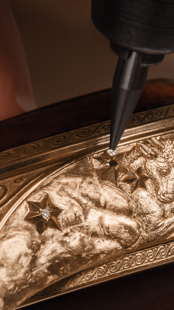 En collaboration avec le sertisseur, le graveur détermine les emplacements de dix diamants taille brillant représentant les Pléiades – amas ouvert de 3 000 étoiles dans la constellation du Taureau dont seule une dizaine est visible à l’œil nu. De deux tailles différentes (0,6 et 0,9 mm), ces brillants sont intégrés en serti clos : six diamants parsèment le ciel éthéré côté couronne, tandis que quatre autres ornent la sculpture du Taureau. Les surfaces planes du ciel et ses constellations sont finalisées en taille douce à l’aide d’une pointe sèche, avec alternance de finitions polies et ciselées pour accentuer les contrastes. L’entre-cornes accueille trois constellations situées autour des Pléiades (Bélier et Mouche à 12 heures, Gémeaux à 6 heures), en taille douce avec terminaisons ciselées.