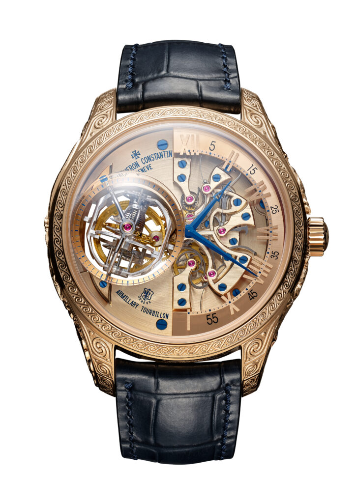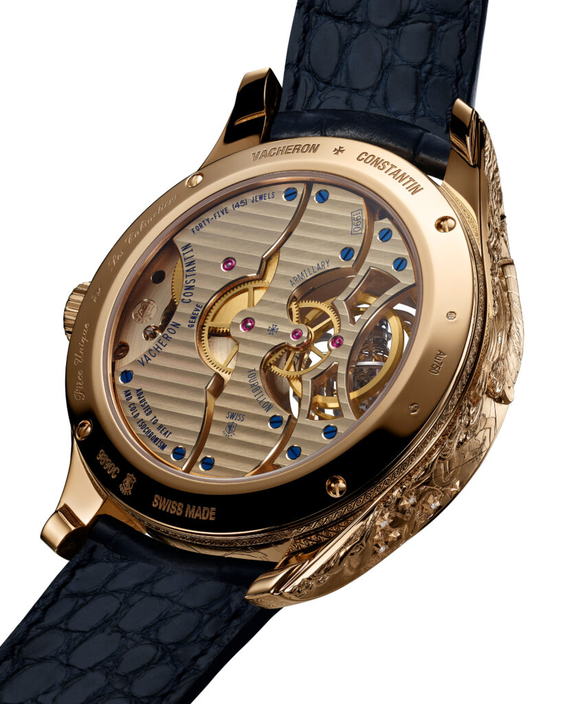 L’architecture des cages du tourbillon qui, dans leur rotation, forment toutes les 15 secondes un motif en croix de Malte, emblème de Vacheron Constantin. Positionné à 9 heures sous une bulle formée par la glace saphir, ce tourbillon armillaire est animé par deux axes de rotation. Cette appellation fait référence aux travaux de l’horloger français du 18ème siècle Antide Janvier, inventeur d’une sphère mouvante permettant d’expliquer les mouvements apparents des astres. Le régulateur est construit avec deux cages en aluminium imbriquées l’une dans l’autre, évoluant sur deux axes différents à raison d’une rotation par minute pour former une sphère en perpétuel mouvement.