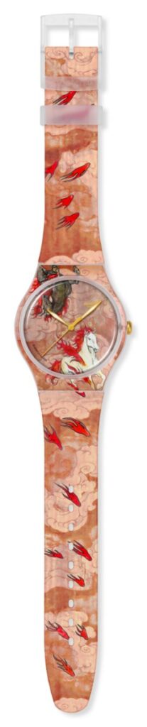 Imaginée en collaboration avec Yu Wenjie, artiste chinois et ancien résident du Swatch Art Peace Hotel de Shanghai, RIDING THE CLOUDS se distingue par une esthétique immédiatement reconnaissable, profondément ancrée dans l’iconographie et la mythologie chinoises. La montre rend hommage aux valeurs traditionnellement associées au Cheval dans le zodiaque : résilience, indépendance, dynamisme, ici renforcées par l’élément du feu, symbole de passion et de vitalité.