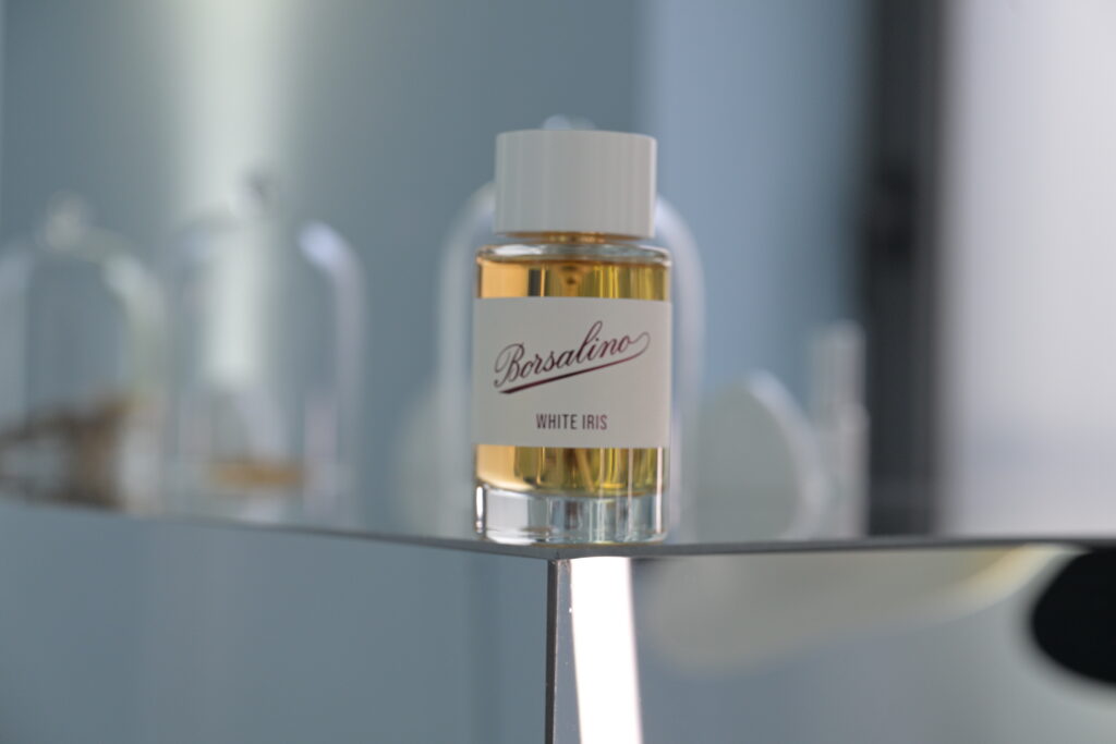 Visuellement, White Iris prolonge l’esthétique rétro-chic de la collection. Le flacon, hommage direct à l’héritage chapelier de la Maison, arbore un capuchon en forme de chapeau, signature iconique de Borsalino. Le ruban-label se pare cette fois de blanc lumineux, rehaussé d’un lettrage bordeaux raffiné. À travers le verre transparent, le jus ambré capte la lumière, évoquant les pellicules dorées du cinéma classique. Une silhouette féminine, intemporelle, résolument cinématographique.