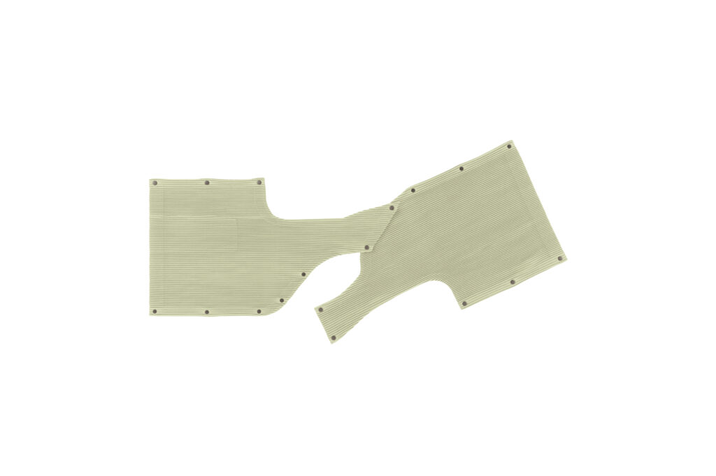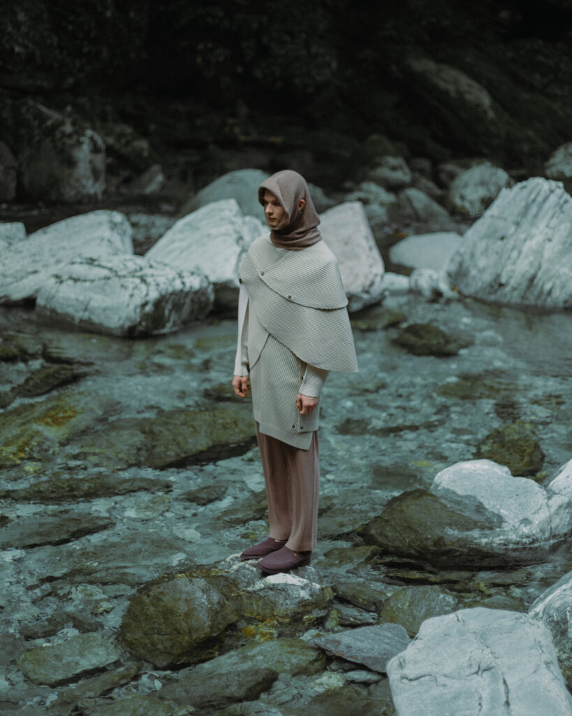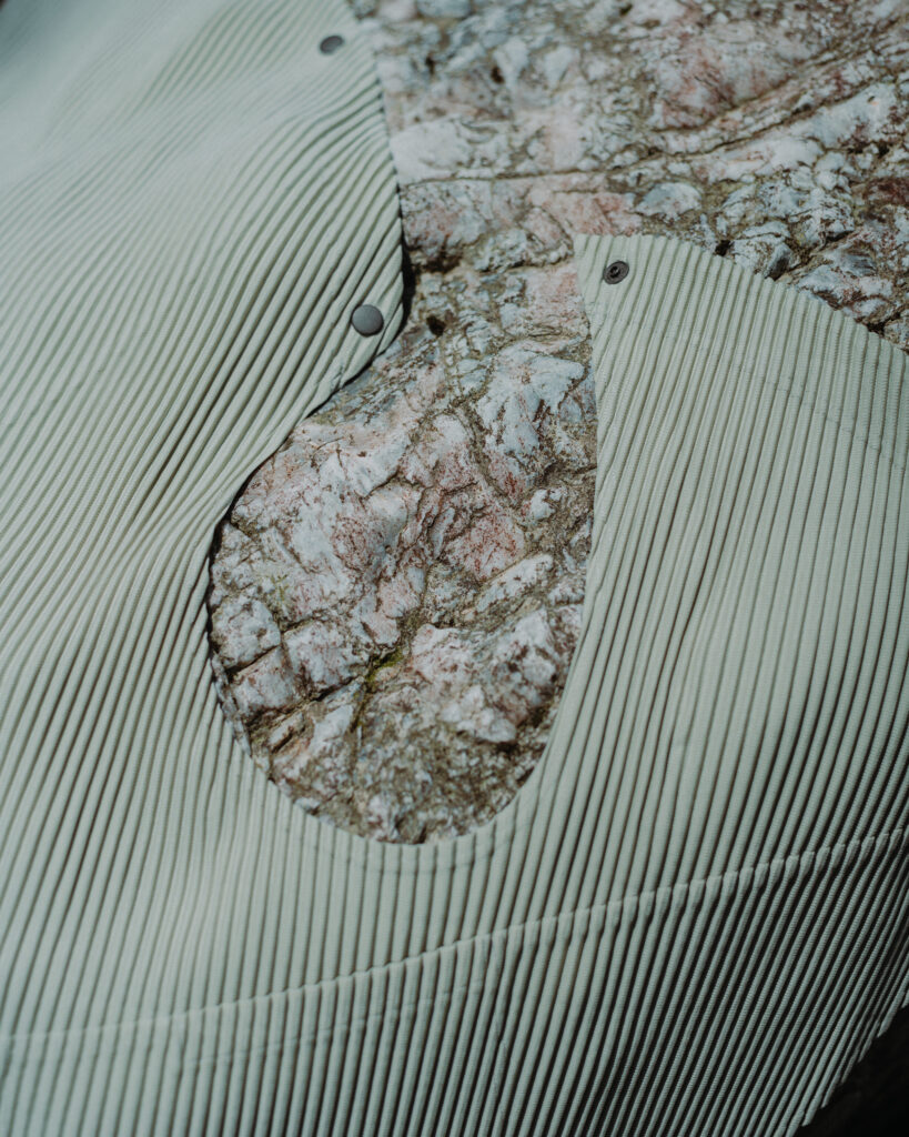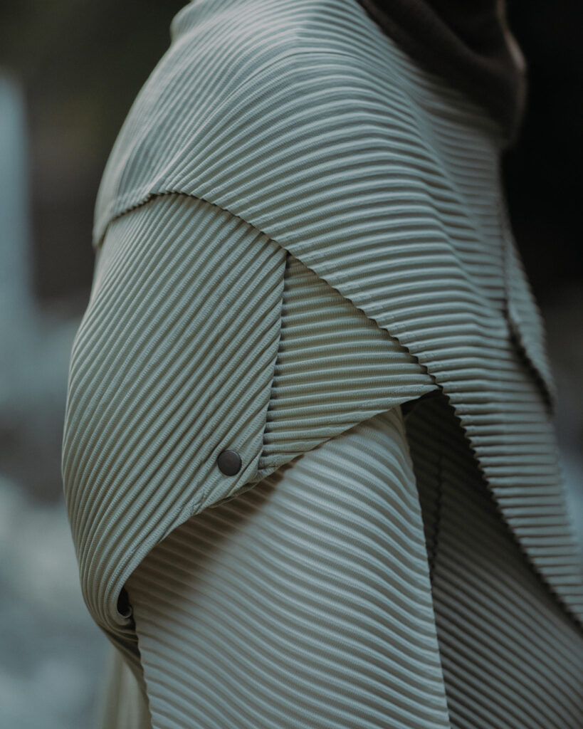 Au cœur de la collection, le gilet style cape (810 €) traduit la beauté de l’érosion naturelle. Inspiré des cavités formées dans la roche par l’eau et les micro-organismes, il se compose de panneaux modulables que l’on peut draper, boutonner, ou laisser glisser librement selon l’humeur du jour. Grâce à son système de boutons-pression répartis sur toute la surface, il se réinvente à chaque port, devenant tour à tour cape, gilet, ou manteau léger.