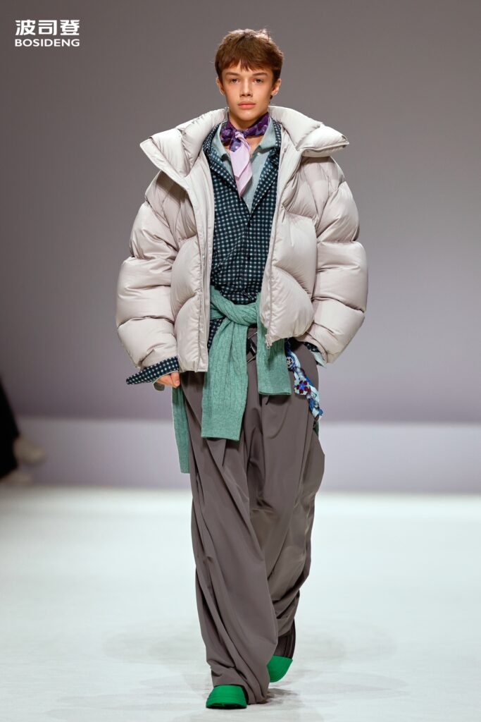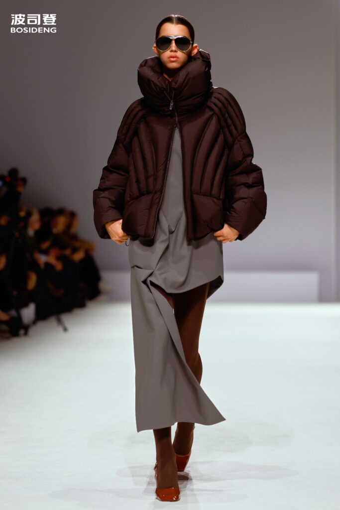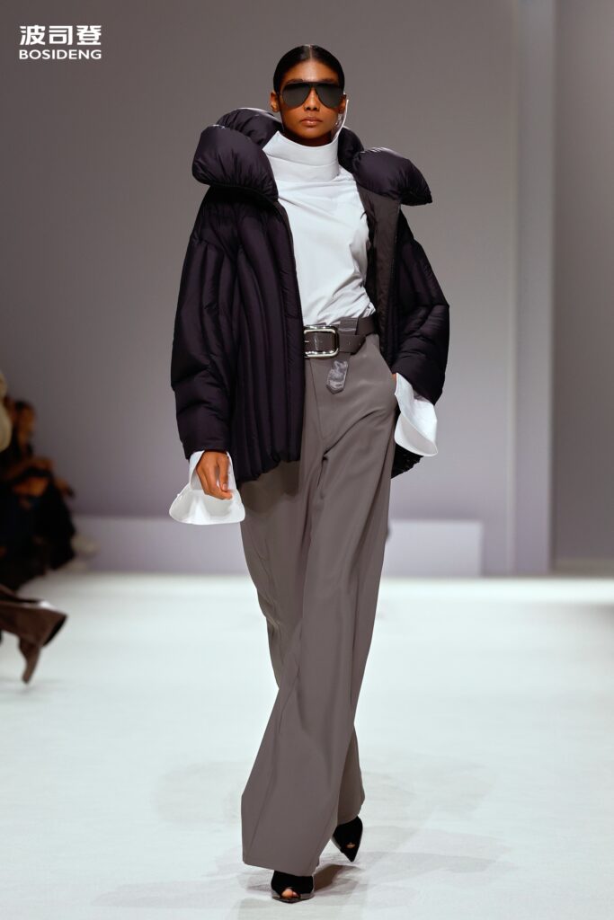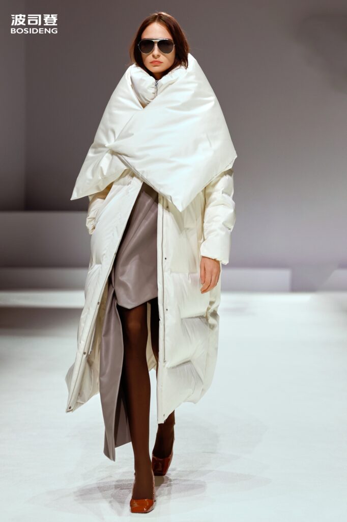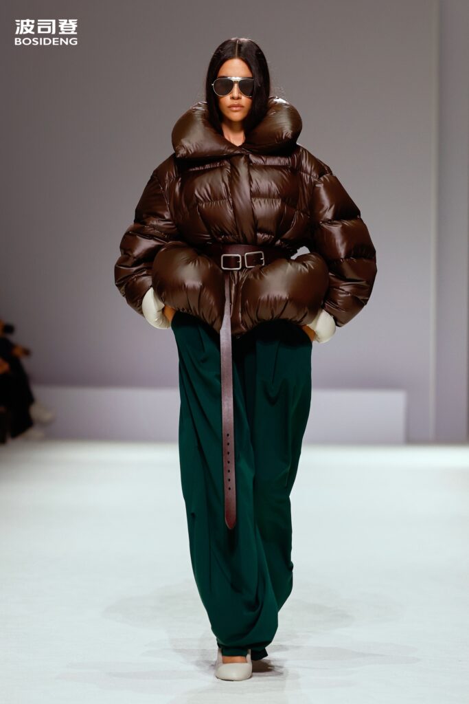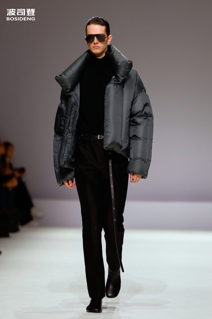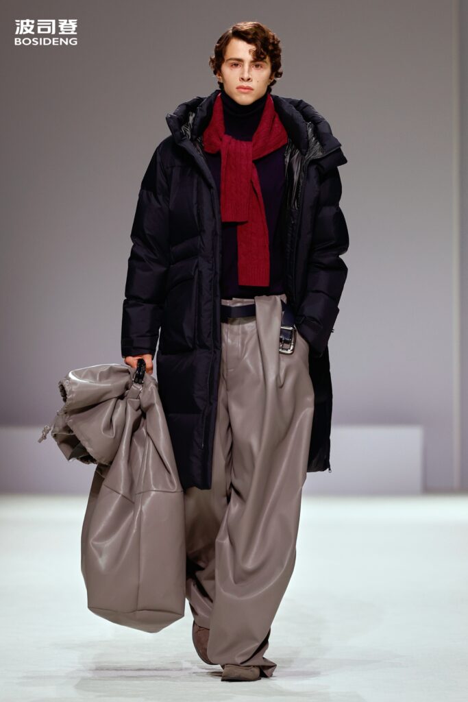 L’innovation majeure de cette présentation réside dans l’effacement de la couture traditionnelle. En remplaçant l’aiguille par le pressage thermique, Bosideng élimine les points de fuite thermique tout en créant une surface visuelle continue, presque liquide. Les cols surdimensionnés et les manches sculpturale ne sont plus des remparts contre le froid, mais des éléments d’une grammaire stylistique fluide. Cette approche technique permet de revisiter l’histoire de la marque — celle qui a équipé les expéditions chinoises en Antarctique et sur l’Everest — en la filtrant par le prisme d’un luxe urbain et contemplatif.