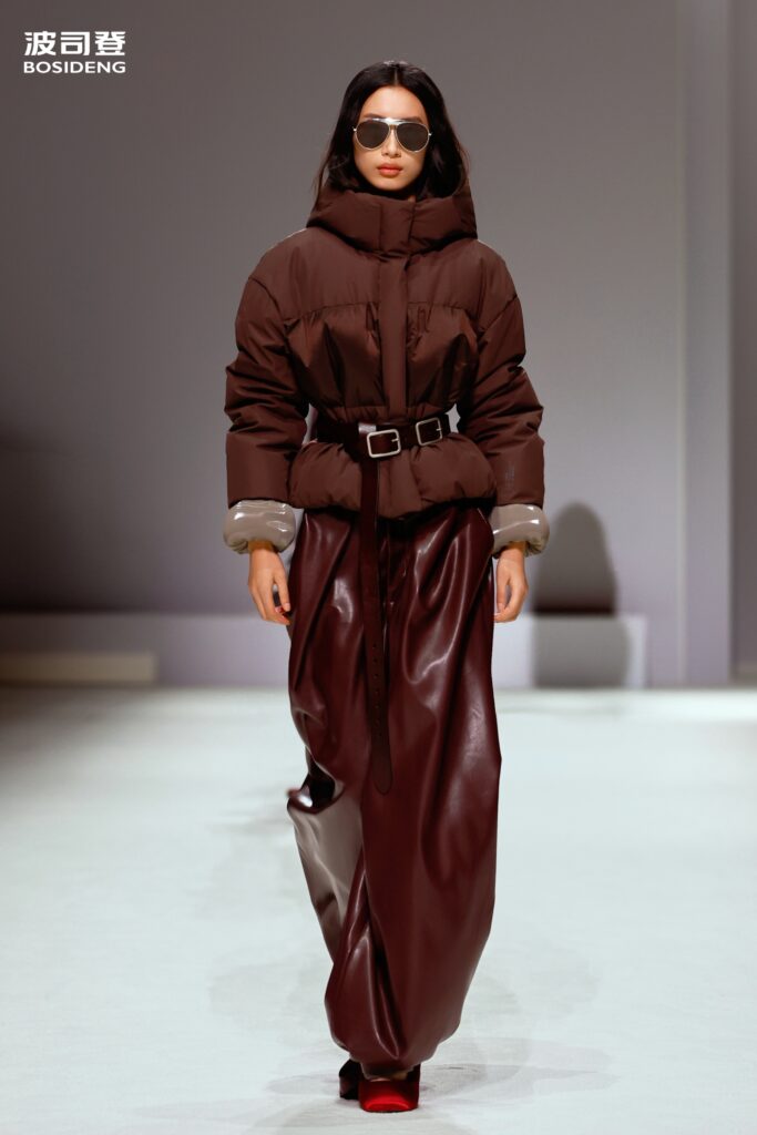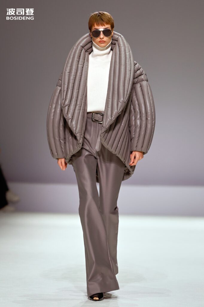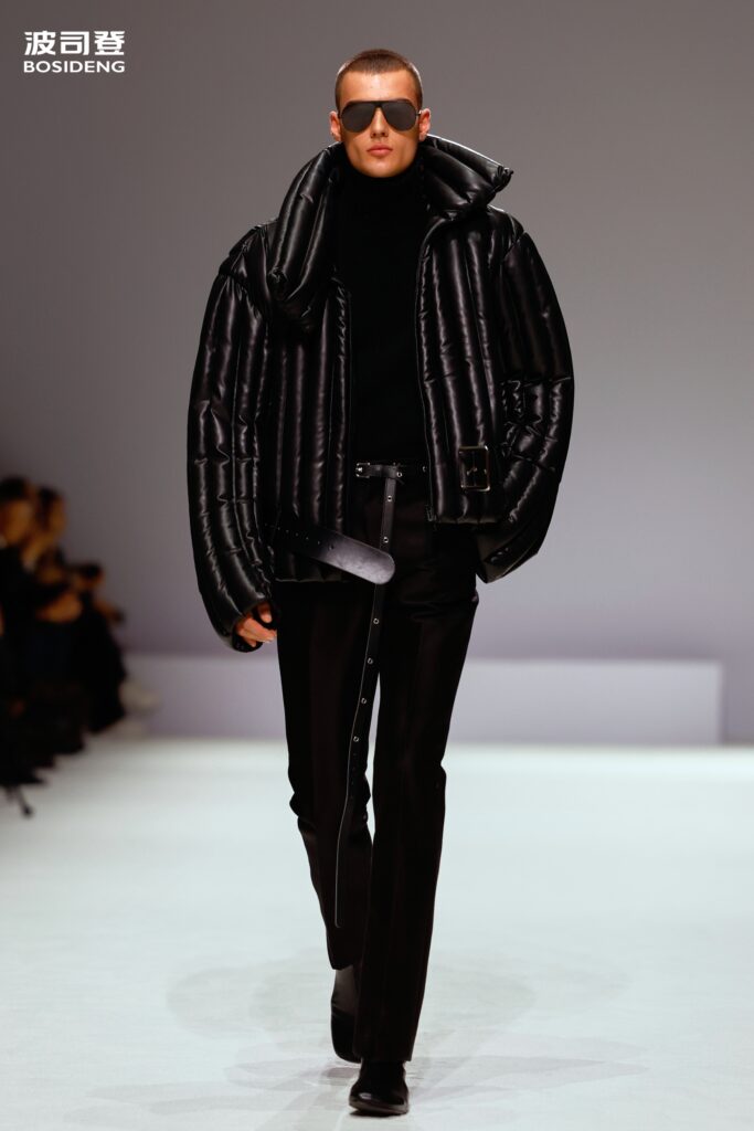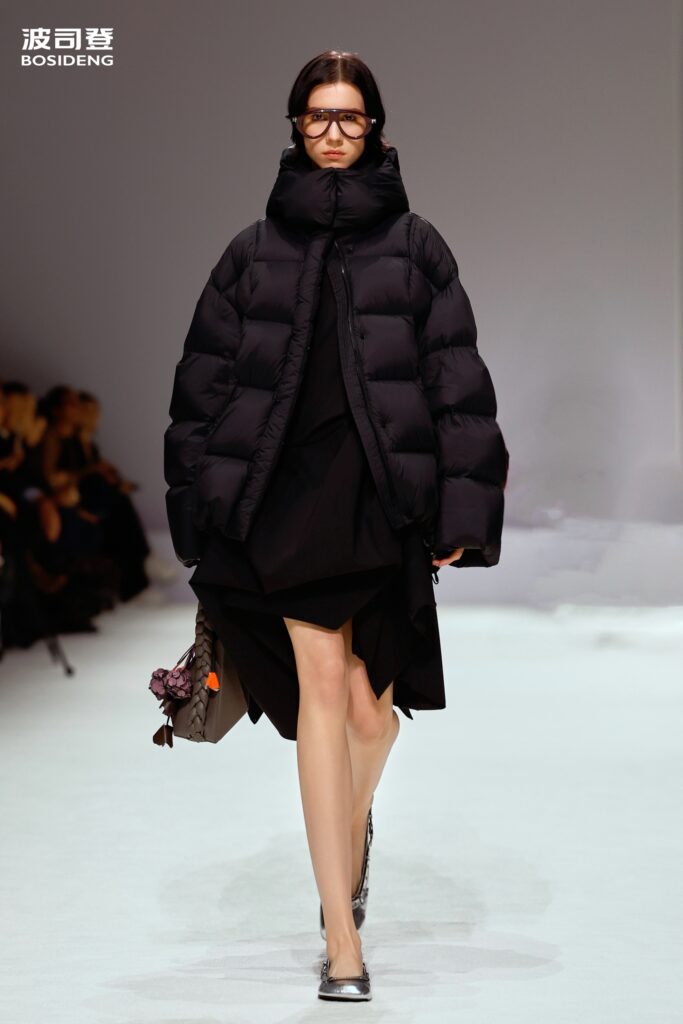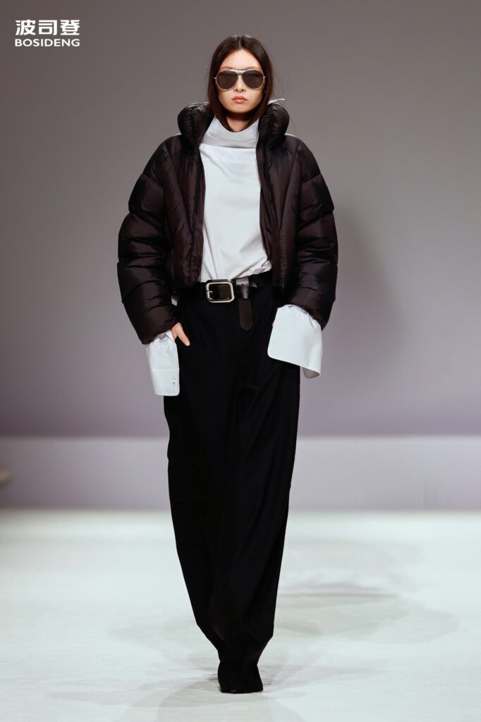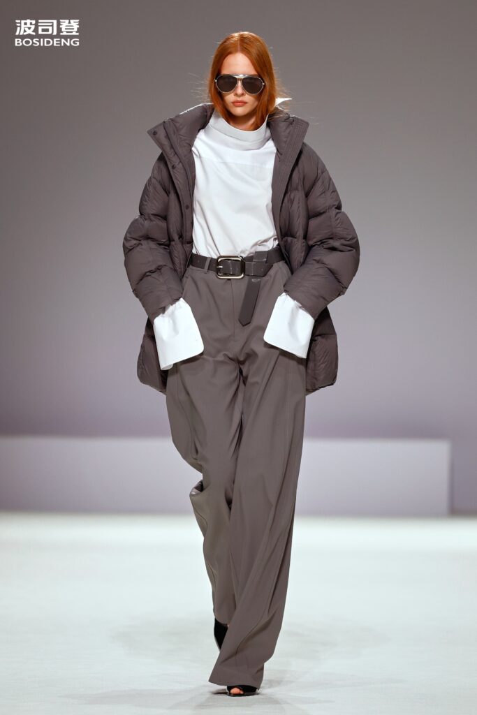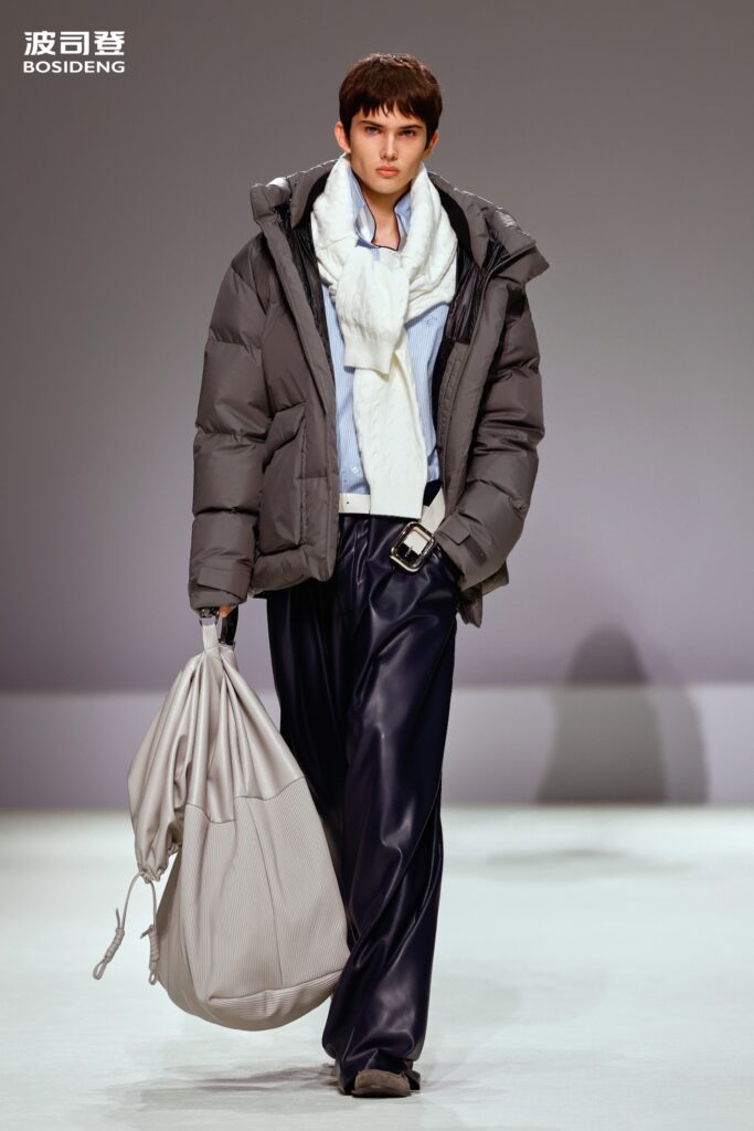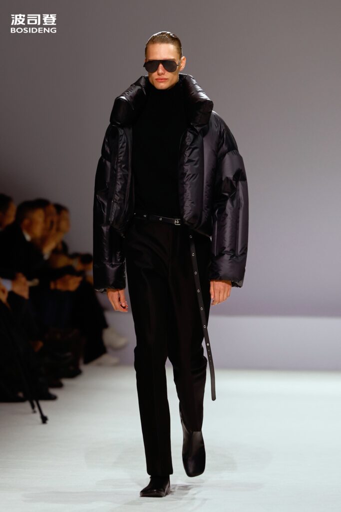 L’innovation majeure de cette présentation réside dans l’effacement de la couture traditionnelle. En remplaçant l’aiguille par le pressage thermique, Bosideng élimine les points de fuite thermique tout en créant une surface visuelle continue, presque liquide. Les cols surdimensionnés et les manches sculpturale ne sont plus des remparts contre le froid, mais des éléments d’une grammaire stylistique fluide. Cette approche technique permet de revisiter l’histoire de la marque — celle qui a équipé les expéditions chinoises en Antarctique et sur l’Everest — en la filtrant par le prisme d’un luxe urbain et contemplatif.
