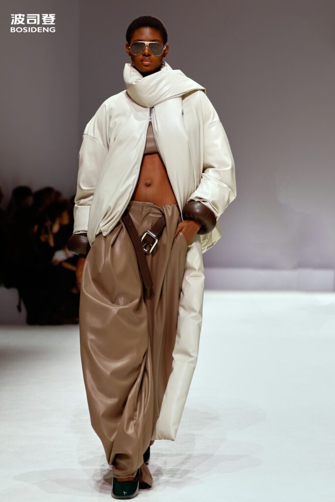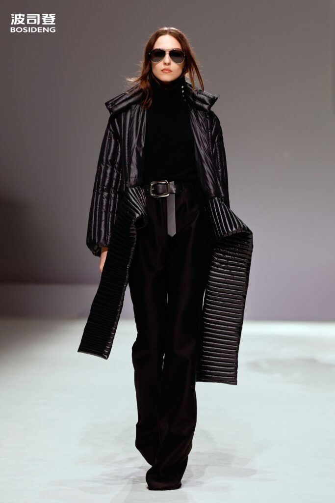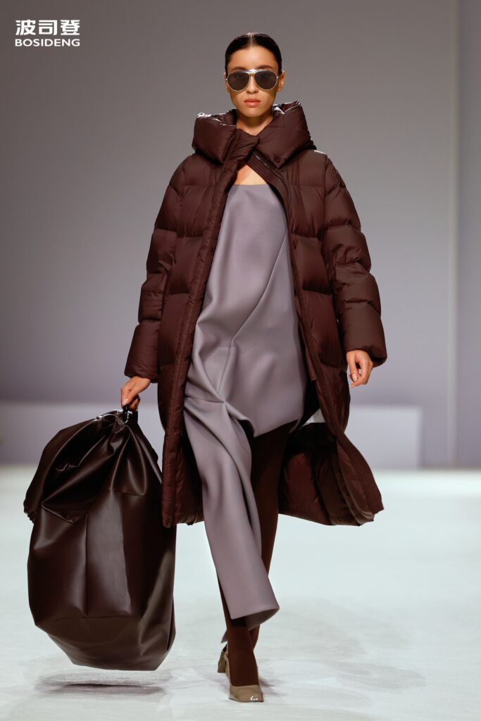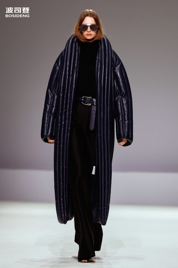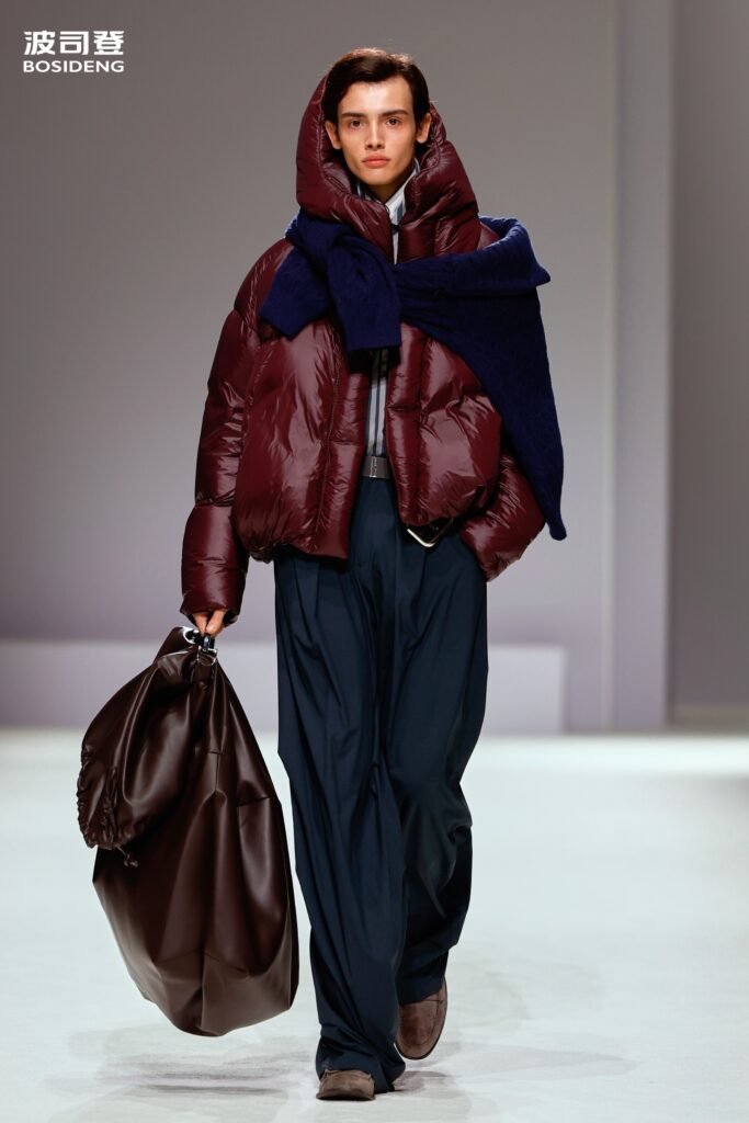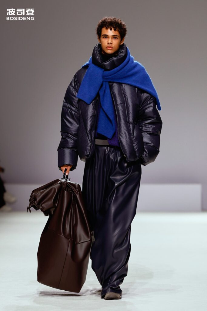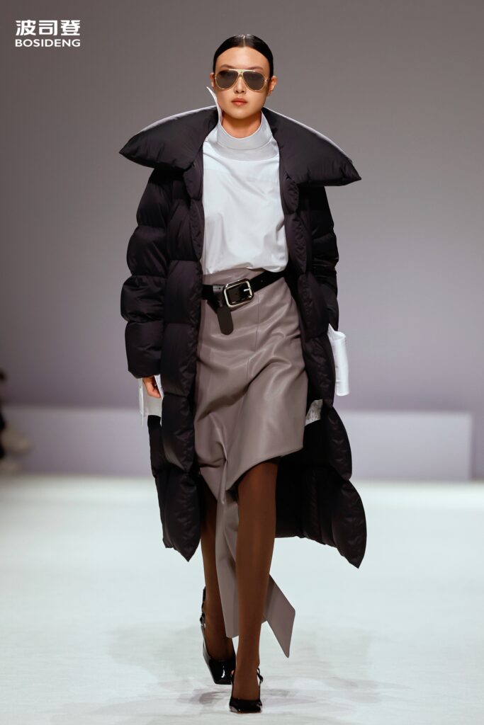 L’innovation majeure de cette présentation réside dans l’effacement de la couture traditionnelle. En remplaçant l’aiguille par le pressage thermique, Bosideng élimine les points de fuite thermique tout en créant une surface visuelle continue, presque liquide. Les cols surdimensionnés et les manches sculpturale ne sont plus des remparts contre le froid, mais des éléments d’une grammaire stylistique fluide. Cette approche technique permet de revisiter l’histoire de la marque — celle qui a équipé les expéditions chinoises en Antarctique et sur l’Everest — en la filtrant par le prisme d’un luxe urbain et contemplatif.