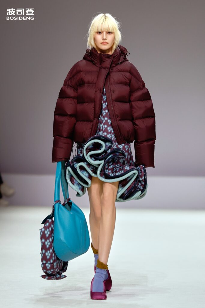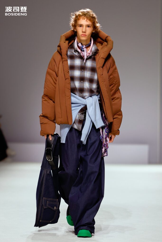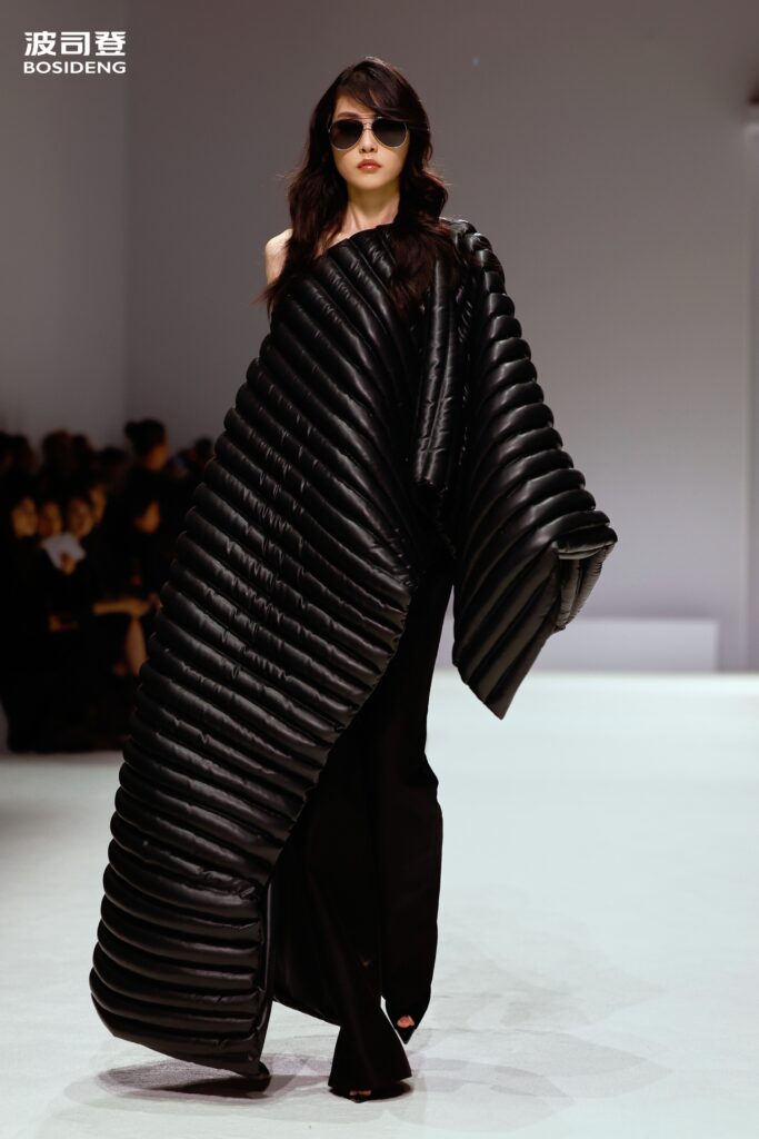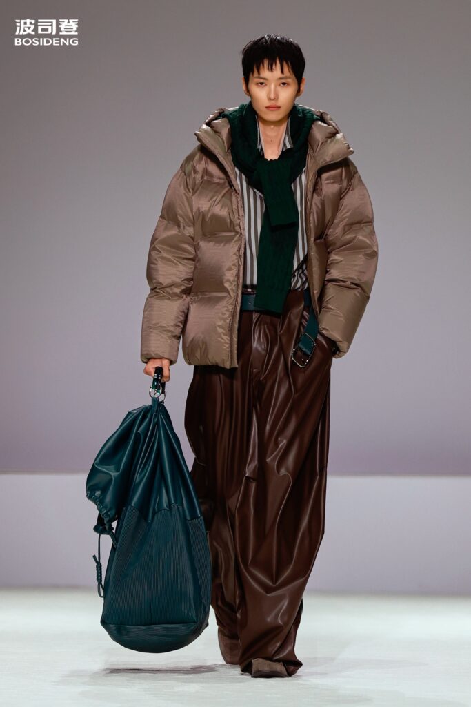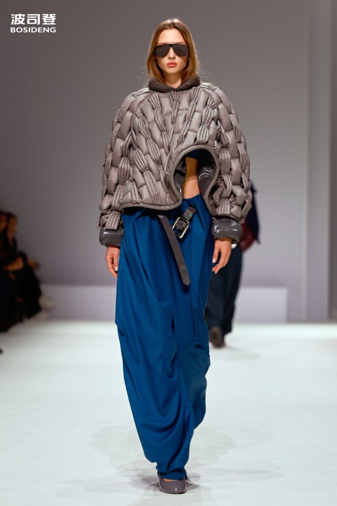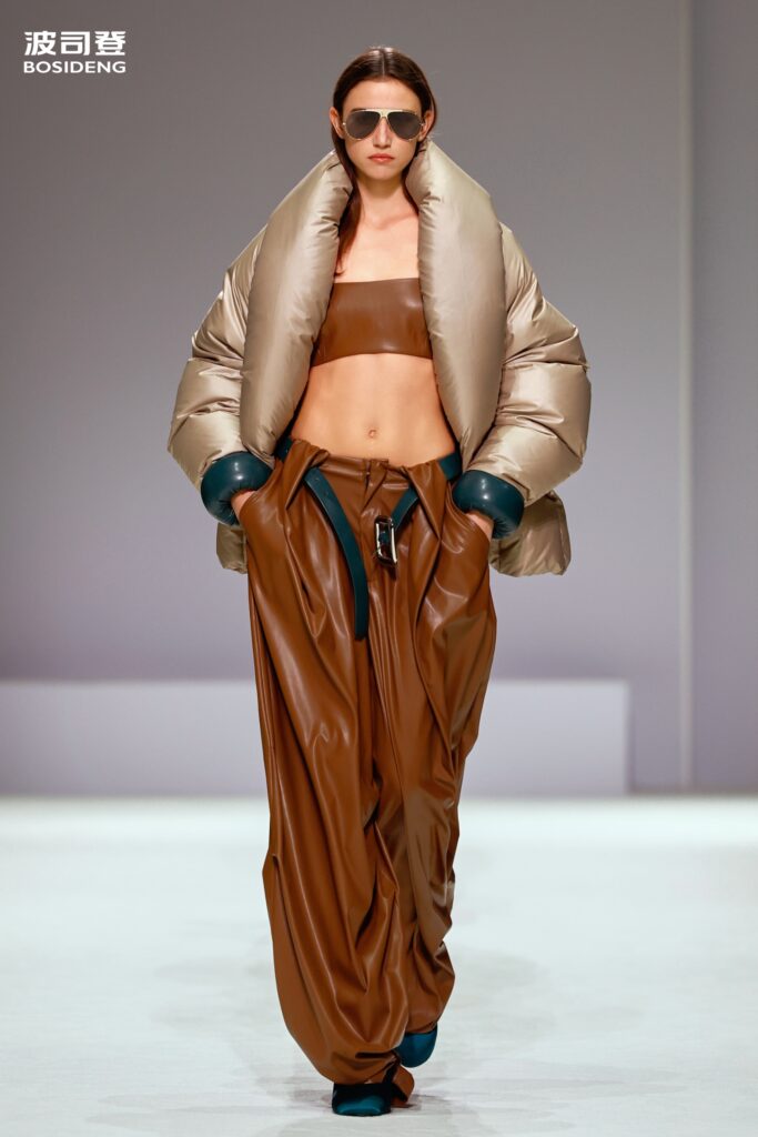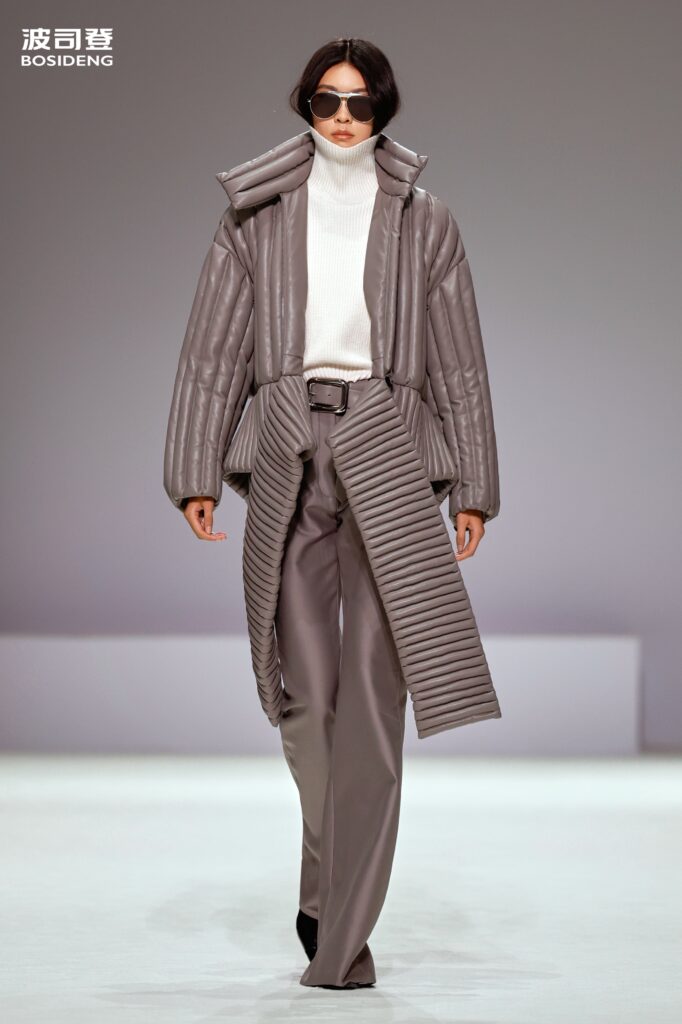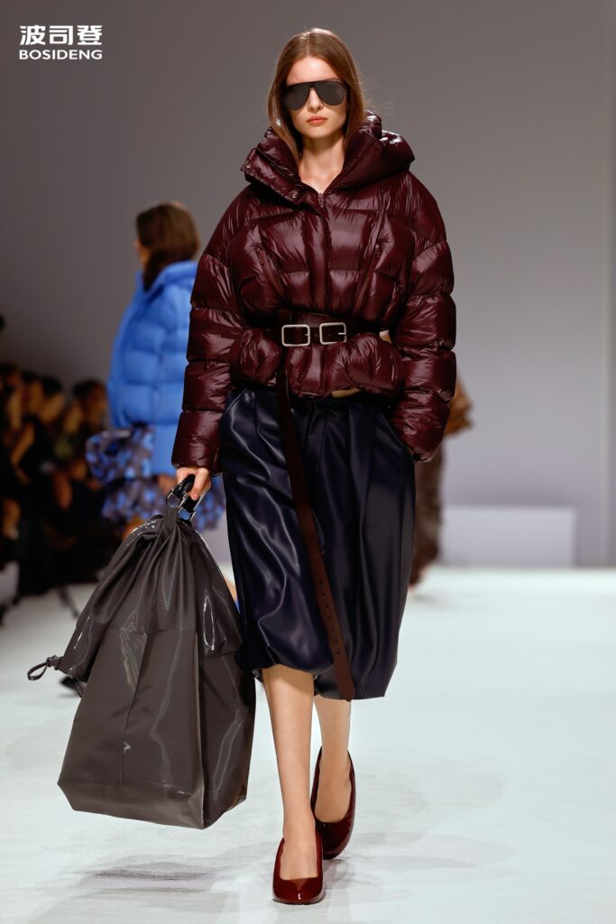 L’innovation majeure de cette présentation réside dans l’effacement de la couture traditionnelle. En remplaçant l’aiguille par le pressage thermique, Bosideng élimine les points de fuite thermique tout en créant une surface visuelle continue, presque liquide. Les cols surdimensionnés et les manches sculpturale ne sont plus des remparts contre le froid, mais des éléments d’une grammaire stylistique fluide. Cette approche technique permet de revisiter l’histoire de la marque — celle qui a équipé les expéditions chinoises en Antarctique et sur l’Everest — en la filtrant par le prisme d’un luxe urbain et contemplatif.