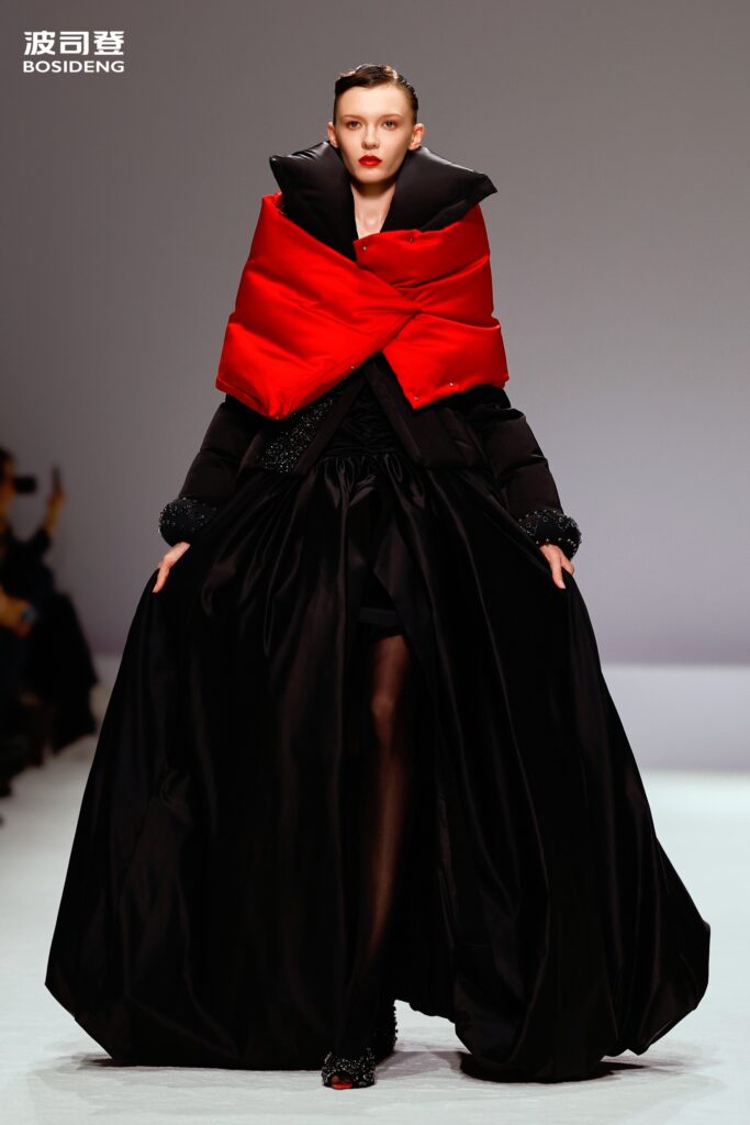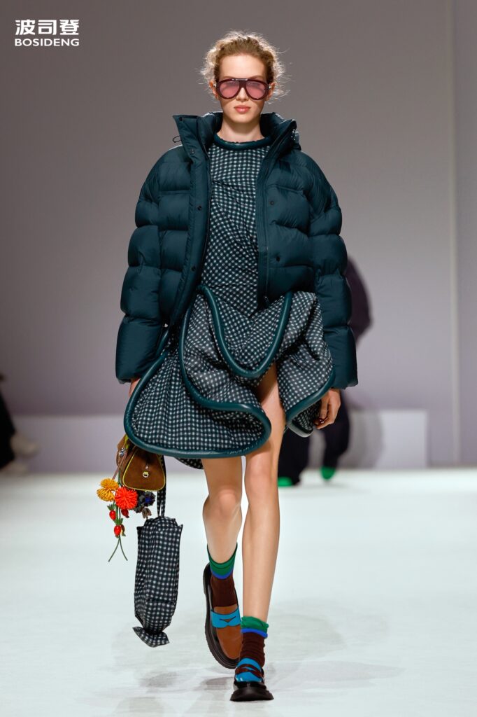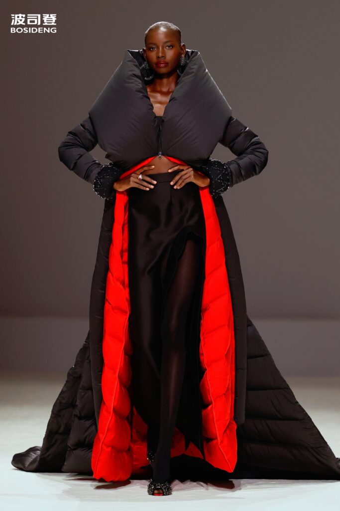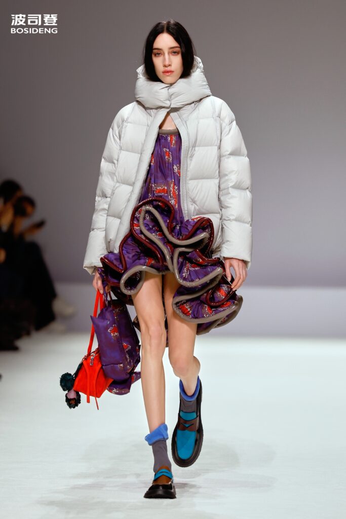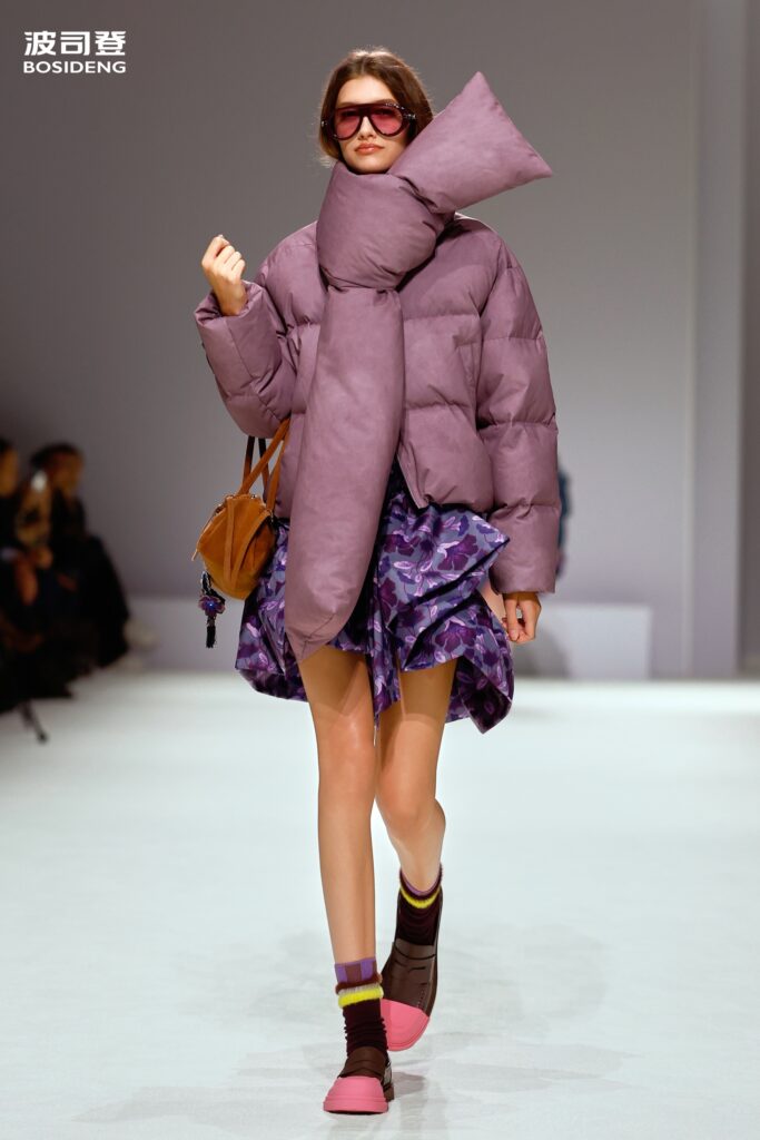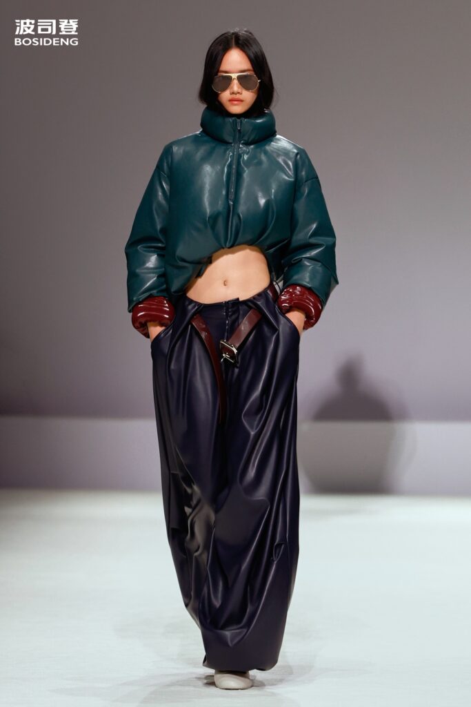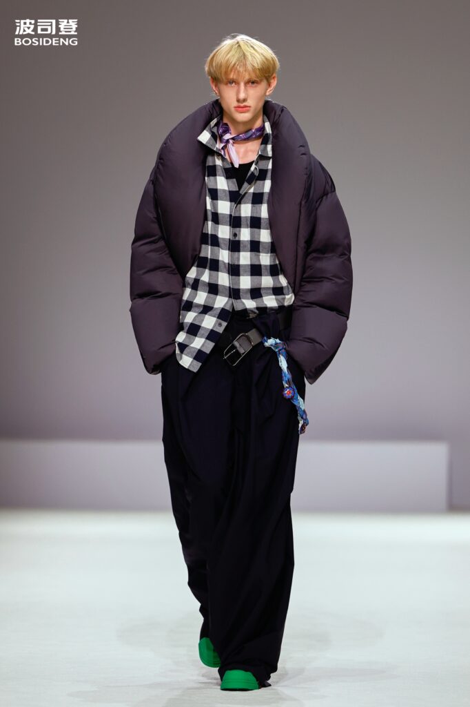 L’innovation majeure de cette présentation réside dans l’effacement de la couture traditionnelle. En remplaçant l’aiguille par le pressage thermique, Bosideng élimine les points de fuite thermique tout en créant une surface visuelle continue, presque liquide. Les cols surdimensionnés et les manches sculpturale ne sont plus des remparts contre le froid, mais des éléments d’une grammaire stylistique fluide. Cette approche technique permet de revisiter l’histoire de la marque — celle qui a équipé les expéditions chinoises en Antarctique et sur l’Everest — en la filtrant par le prisme d’un luxe urbain et contemplatif.