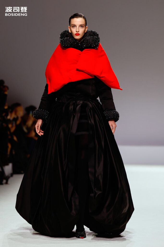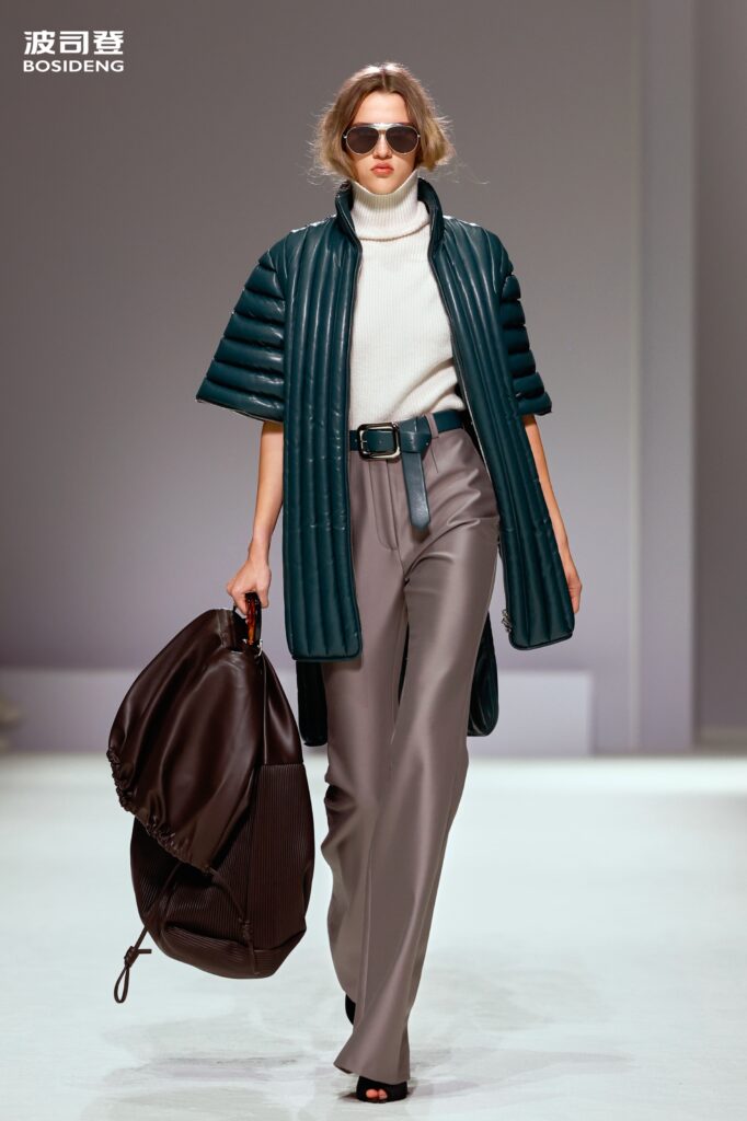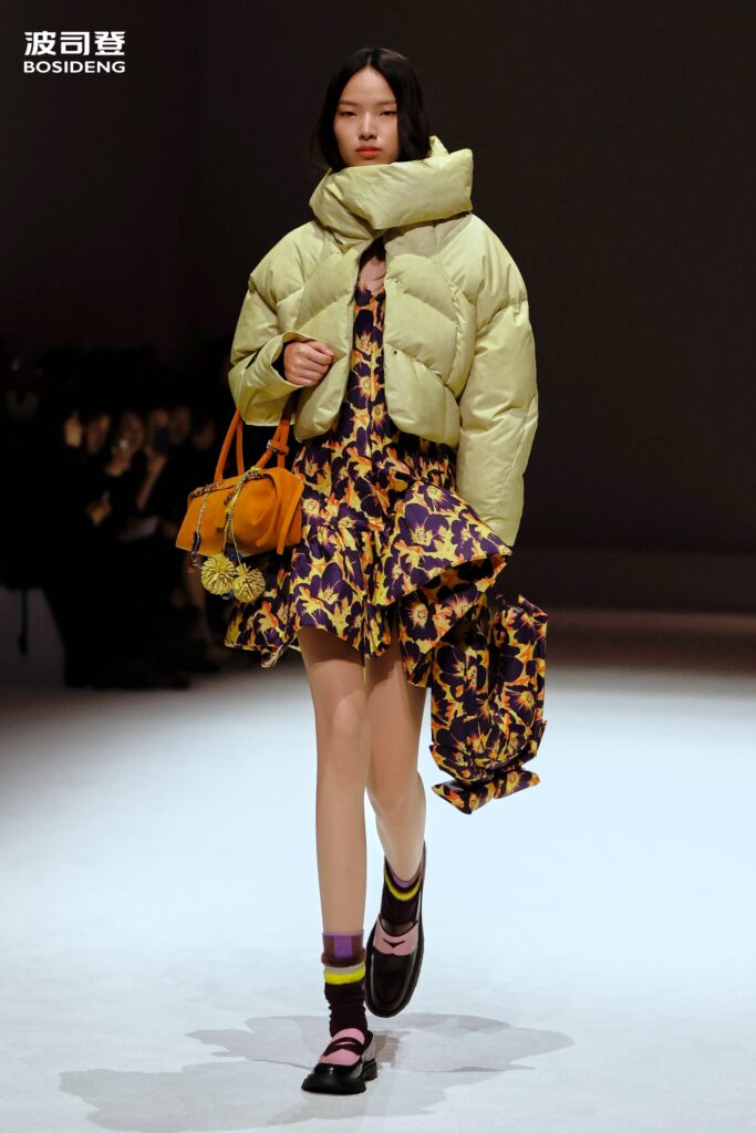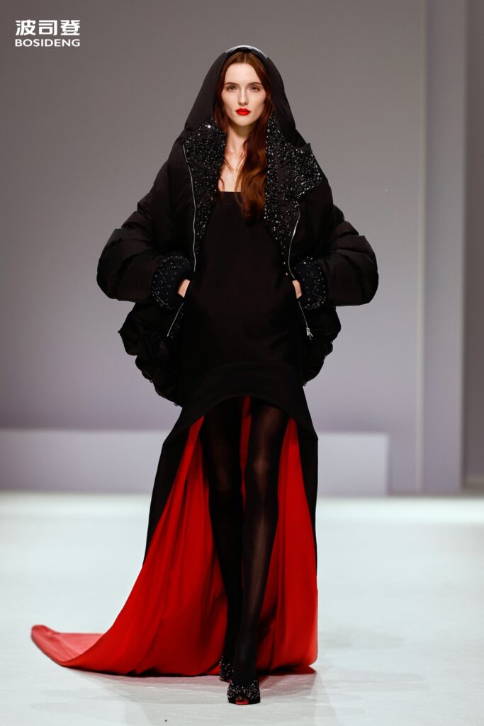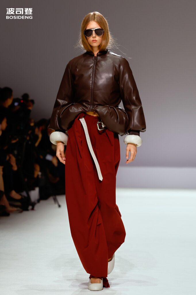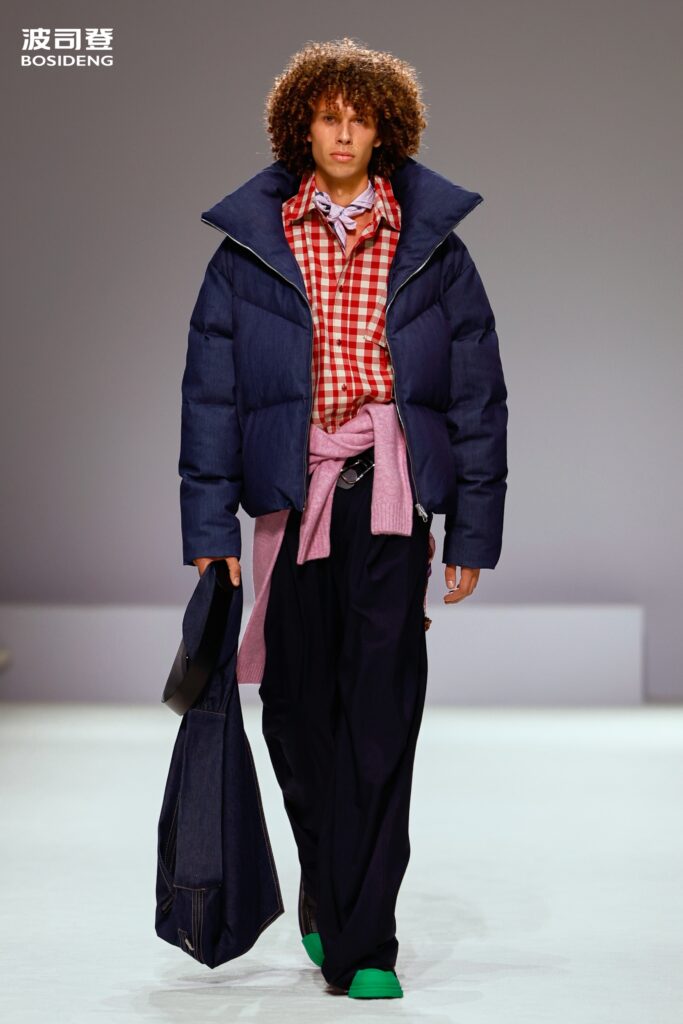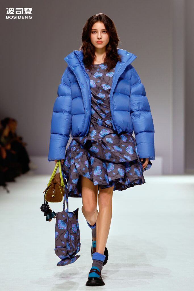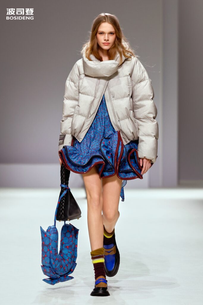 L’innovation majeure de cette présentation réside dans l’effacement de la couture traditionnelle. En remplaçant l’aiguille par le pressage thermique, Bosideng élimine les points de fuite thermique tout en créant une surface visuelle continue, presque liquide. Les cols surdimensionnés et les manches sculpturale ne sont plus des remparts contre le froid, mais des éléments d’une grammaire stylistique fluide. Cette approche technique permet de revisiter l’histoire de la marque — celle qui a équipé les expéditions chinoises en Antarctique et sur l’Everest — en la filtrant par le prisme d’un luxe urbain et contemplatif.