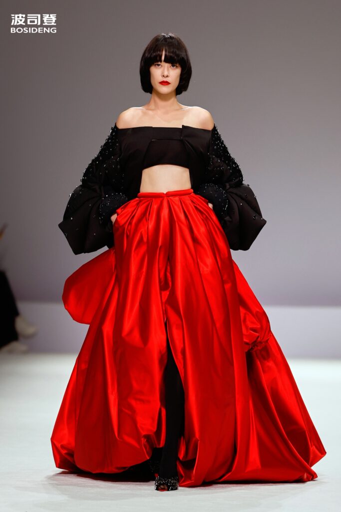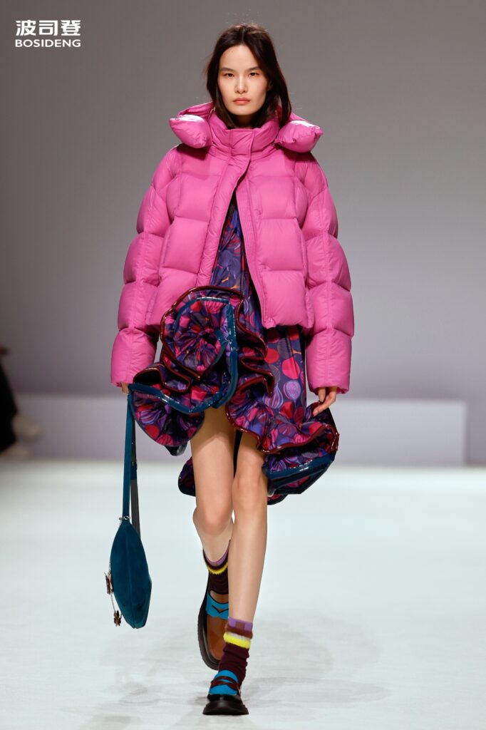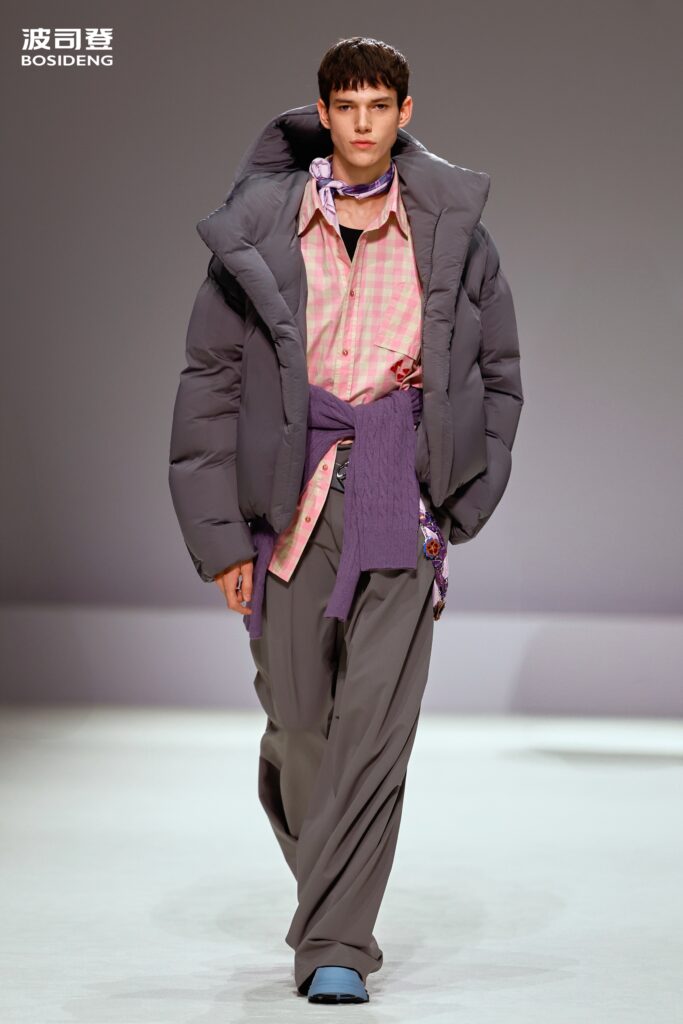 Le dialogue culturel se poursuit dans la palette chromatique. Loin des couleurs primaires du sportswear, Bosideng puise dans l’héritage pictural chinois pour habiller ses volumes : brun chameau, noir d’encre, olive profond et ce « rose racine de lotus » (Lotus Root Pink), teinte subtile et terreuse qui ancre la collection dans une naturalité sophistiquée. En réussissant cette synthèse entre la rigueur industrielle de l’Empire du Milieu et les codes de l’élégance parisienne, Bosideng ne cherche plus à prouver sa capacité à produire, mais sa légitimité à définir l’allure de l’hiver contemporain.