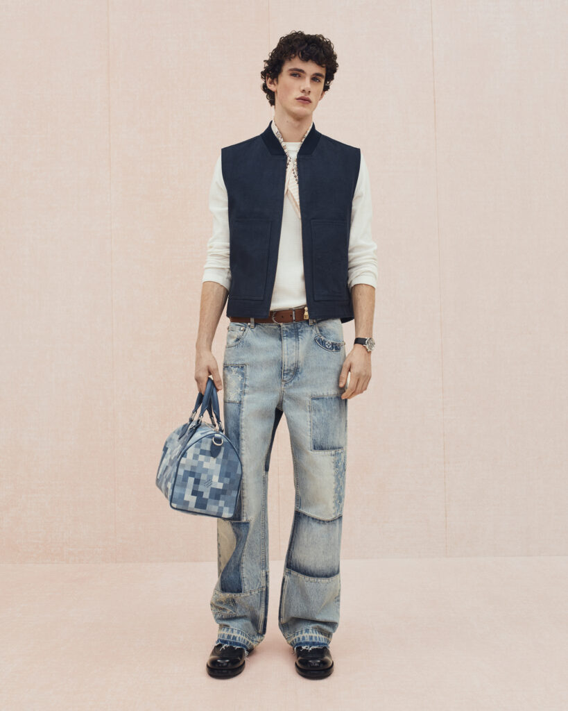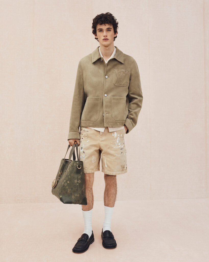 Les premiers chapitres revisitent les classiques du vestiaire masculin. Les costumes se fragmentent : vestes chic allégées, blousons techniques imprimés Prince-de-Galles Monogram, denim traité comme un uniforme générationnel. Le Monogram Surplus, signature visuelle de la saison, se décline sur vestes de travail, chemises courtes, shorts de skateur ou pièces en nylon fil-coupé et cuir laseré, affirmant une esthétique utilitaire raffinée. Les références à l’héritage gentleman sont volontairement « déconstruites », portées comme des vêtements hérités, patinés par la vie.