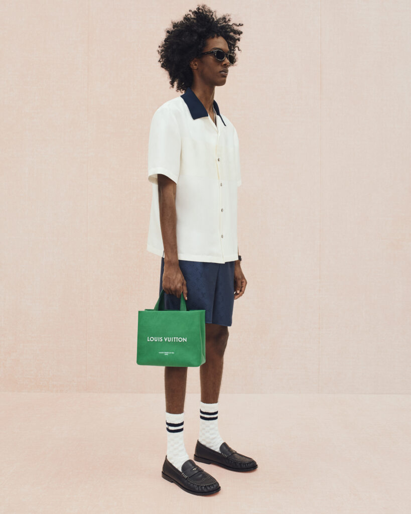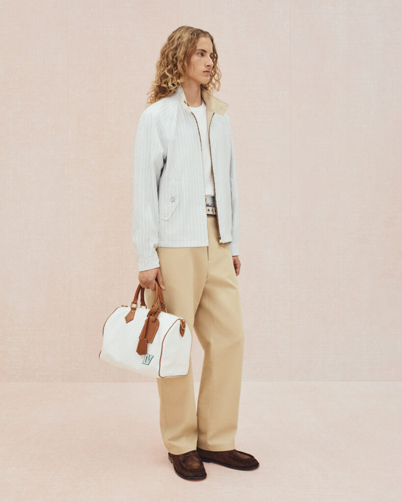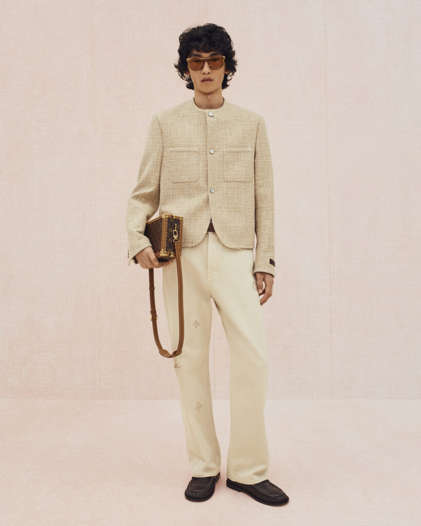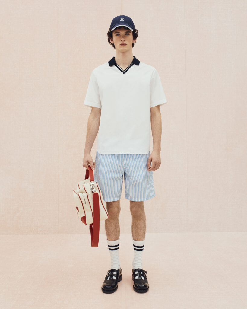 La collection bascule ensuite vers un vestiaire estival, où le tailoring en lin se mêle aux pièces de détente : chemises à manches courtes, pantalons souples, boxers apparents et soies jacquard discrètement monogrammées. Les motifs iconiques de Louis Vuitton se fragmentent, se fondent dans les rayures ou apparaissent en versions pastel. Le raffia, évoqué à travers des fils Damier ou des polos crochetés à la main, ancre la collection dans un luxe solaire et tactile.