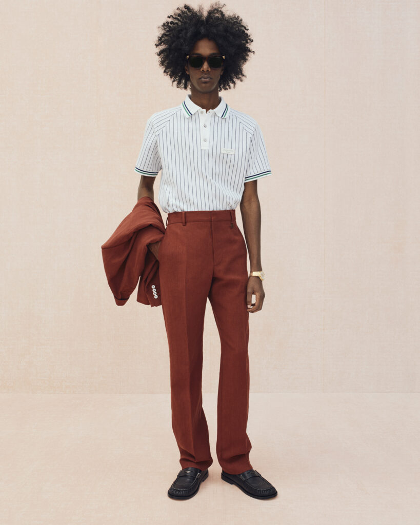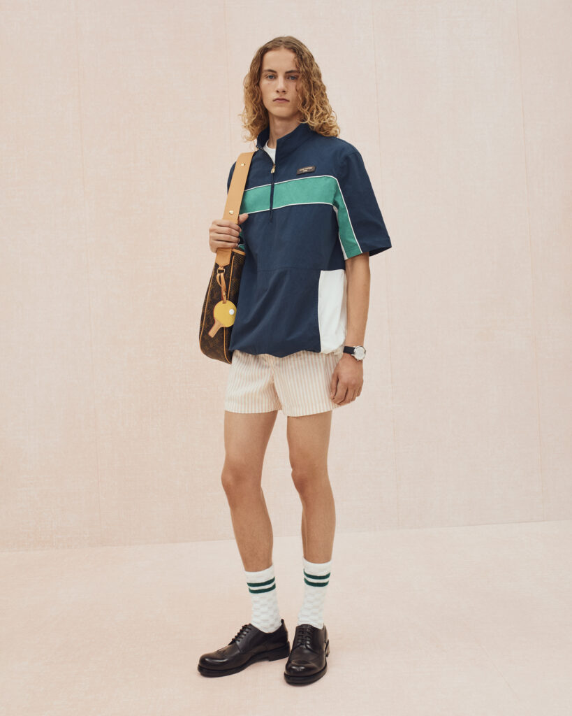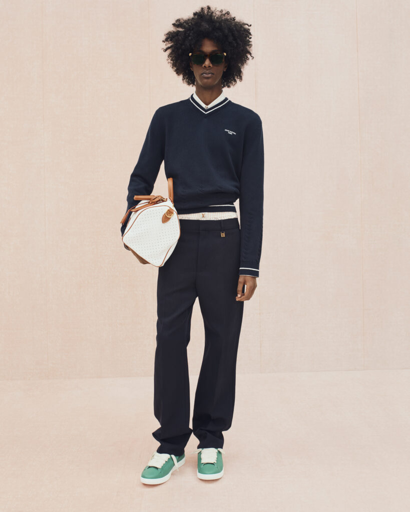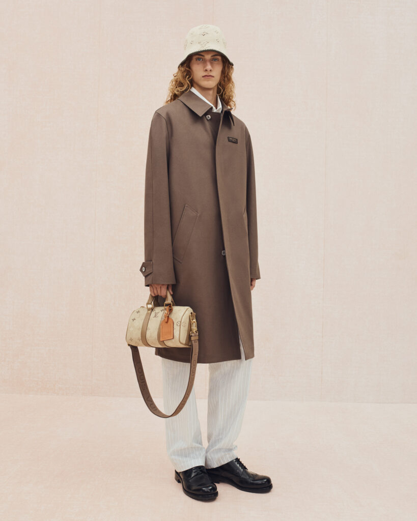 La collection bascule ensuite vers un vestiaire estival, où le tailoring en lin se mêle aux pièces de détente : chemises à manches courtes, pantalons souples, boxers apparents et soies jacquard discrètement monogrammées. Les motifs iconiques de Louis Vuitton se fragmentent, se fondent dans les rayures ou apparaissent en versions pastel. Le raffia, évoqué à travers des fils Damier ou des polos crochetés à la main, ancre la collection dans un luxe solaire et tactile.