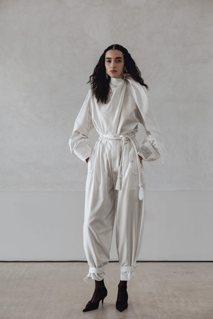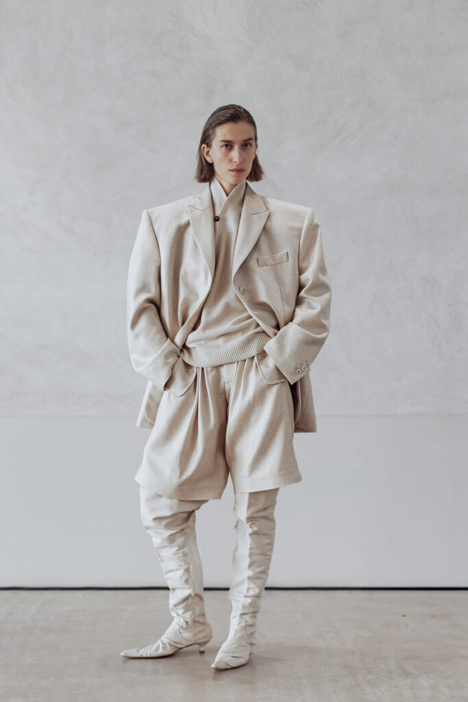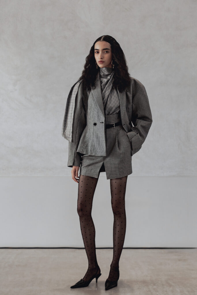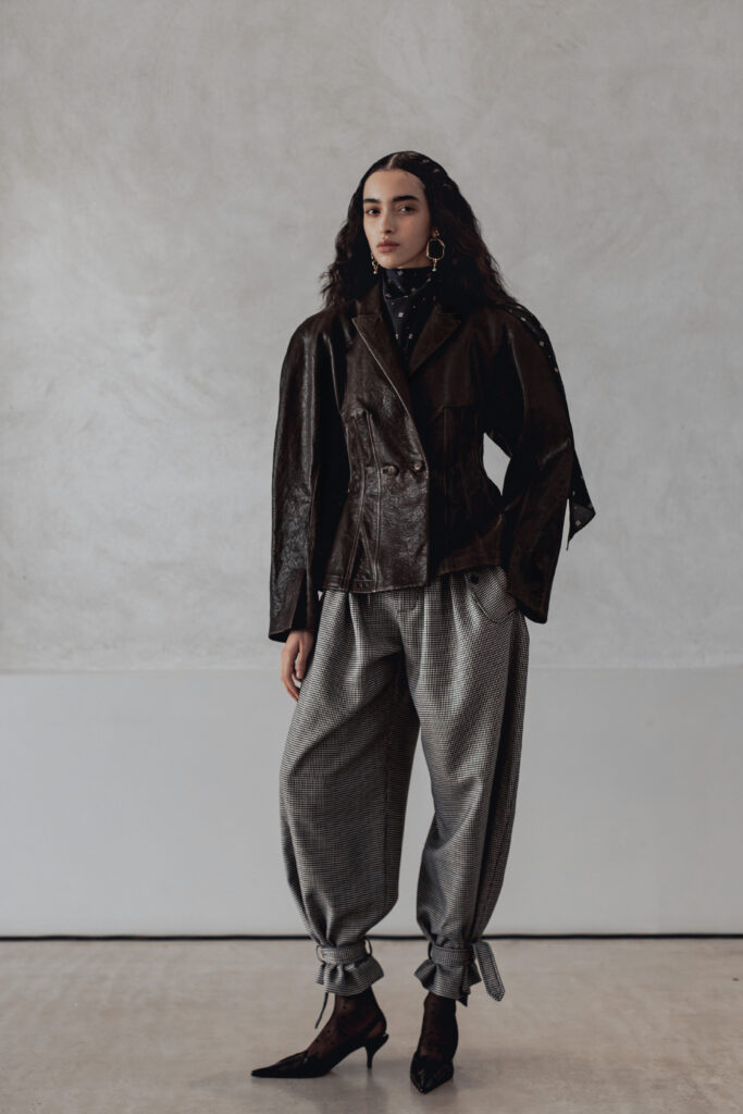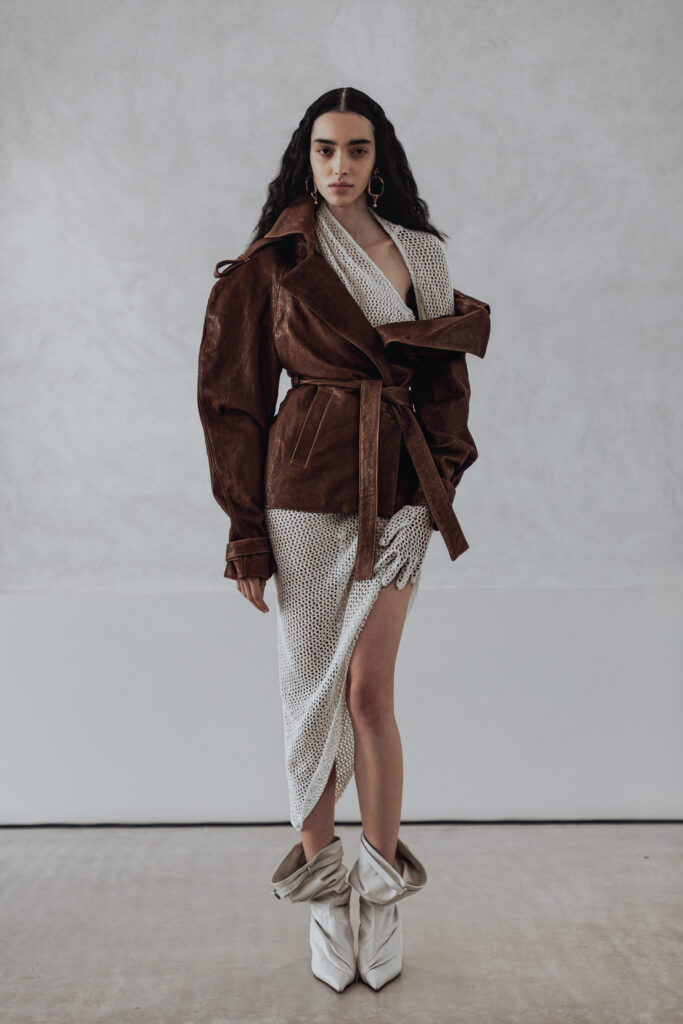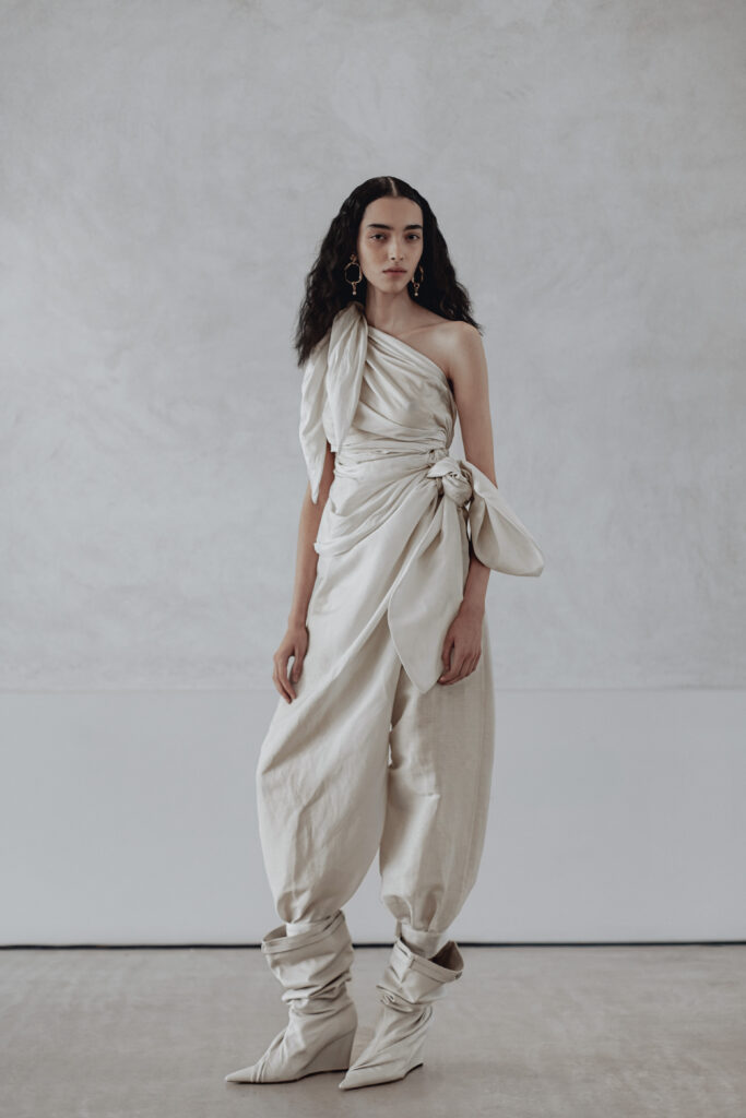 Les pièces présentées lors de la Paris Fashion Week jouent sur des références vintage filtrées, des épaules structurées, des vestes courtes, des boutons recouverts. Les silhouettes drapées et taillées évoquent le power dressing des années 1980, mais sans jamais le citer frontalement. Des bottes pointues accompagnent l’ensemble. La palette reste éteinte, les textures naturelles — lin, soie impalpable, cuir. Carmel refuse la couleur comme il refuse l’ornement : ce sont des « voiles » qui masquent la structure.