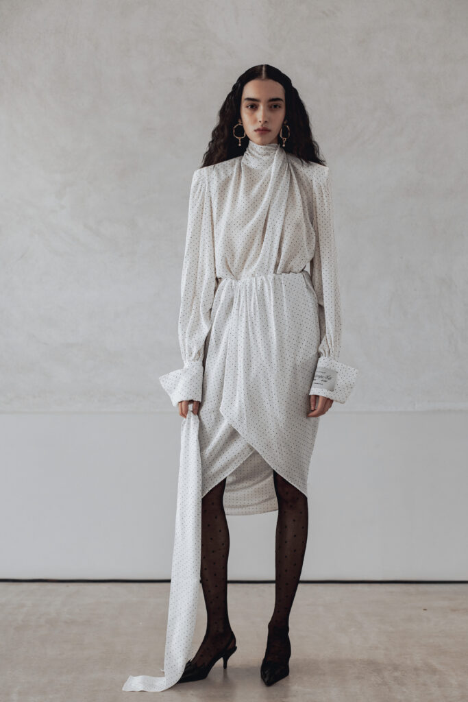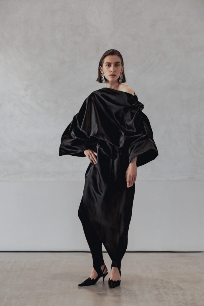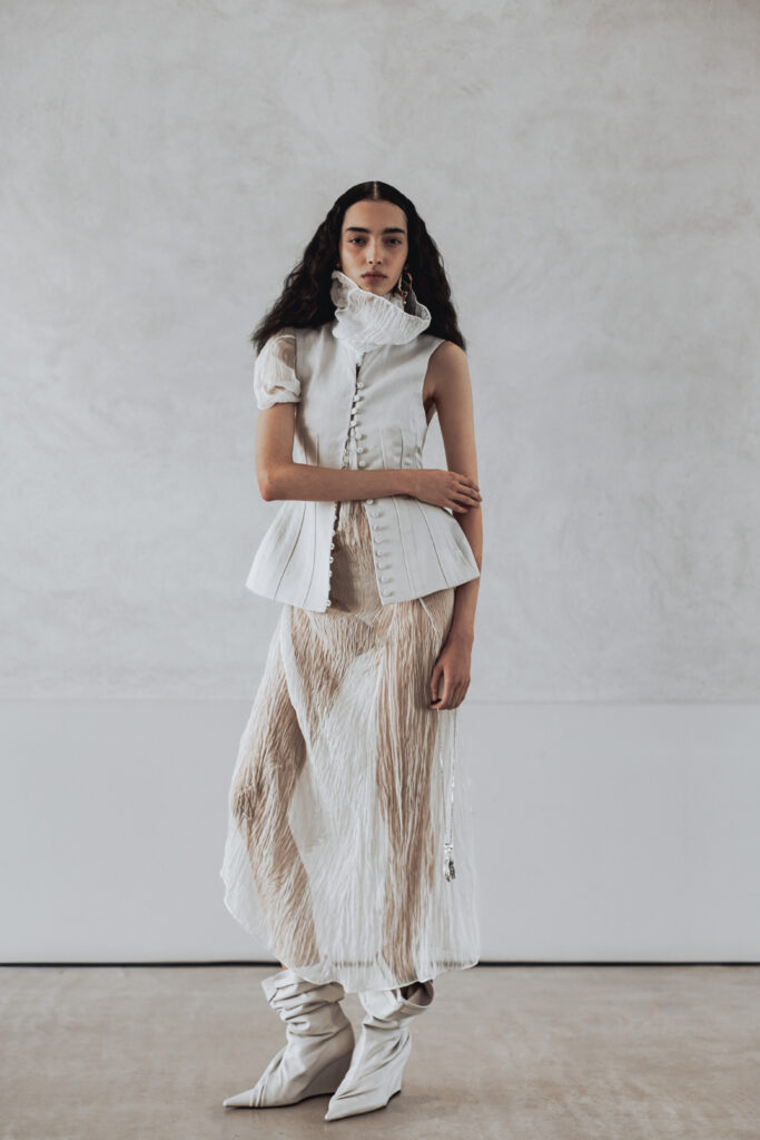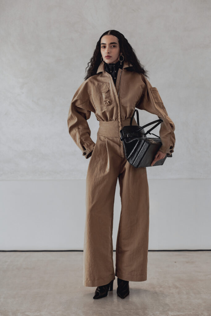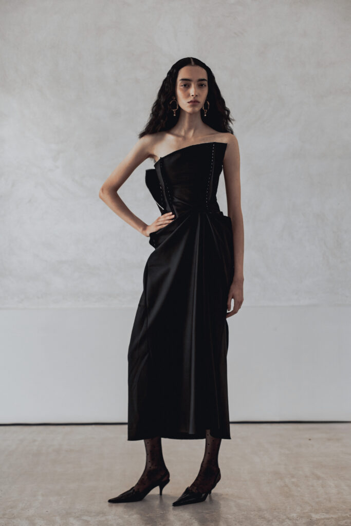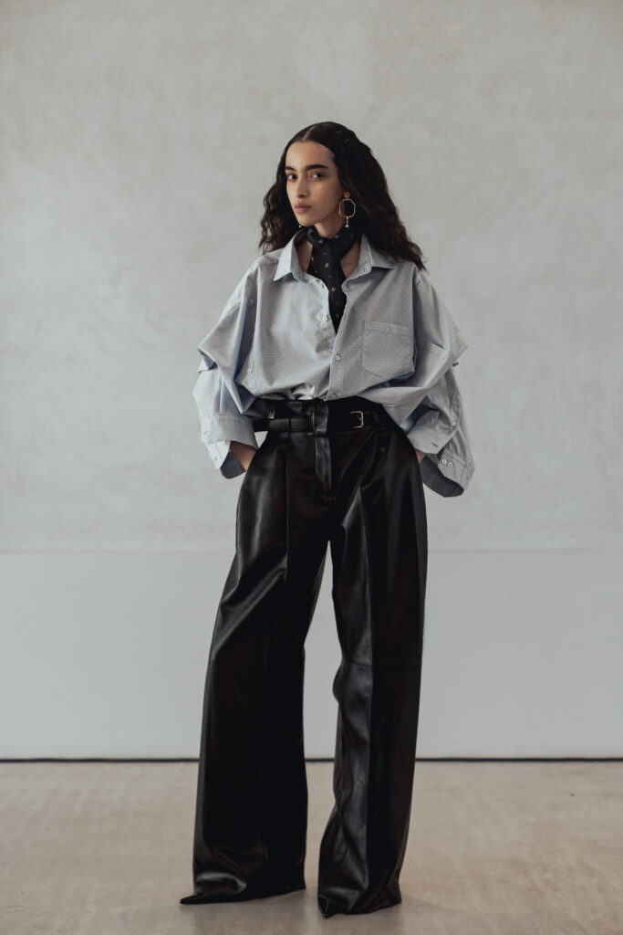 Les pièces présentées lors de la Paris Fashion Week jouent sur des références vintage filtrées, des épaules structurées, des vestes courtes, des boutons recouverts. Les silhouettes drapées et taillées évoquent le power dressing des années 1980, mais sans jamais le citer frontalement. Des bottes pointues accompagnent l’ensemble. La palette reste éteinte, les textures naturelles — lin, soie impalpable, cuir. Carmel refuse la couleur comme il refuse l’ornement : ce sont des « voiles » qui masquent la structure.