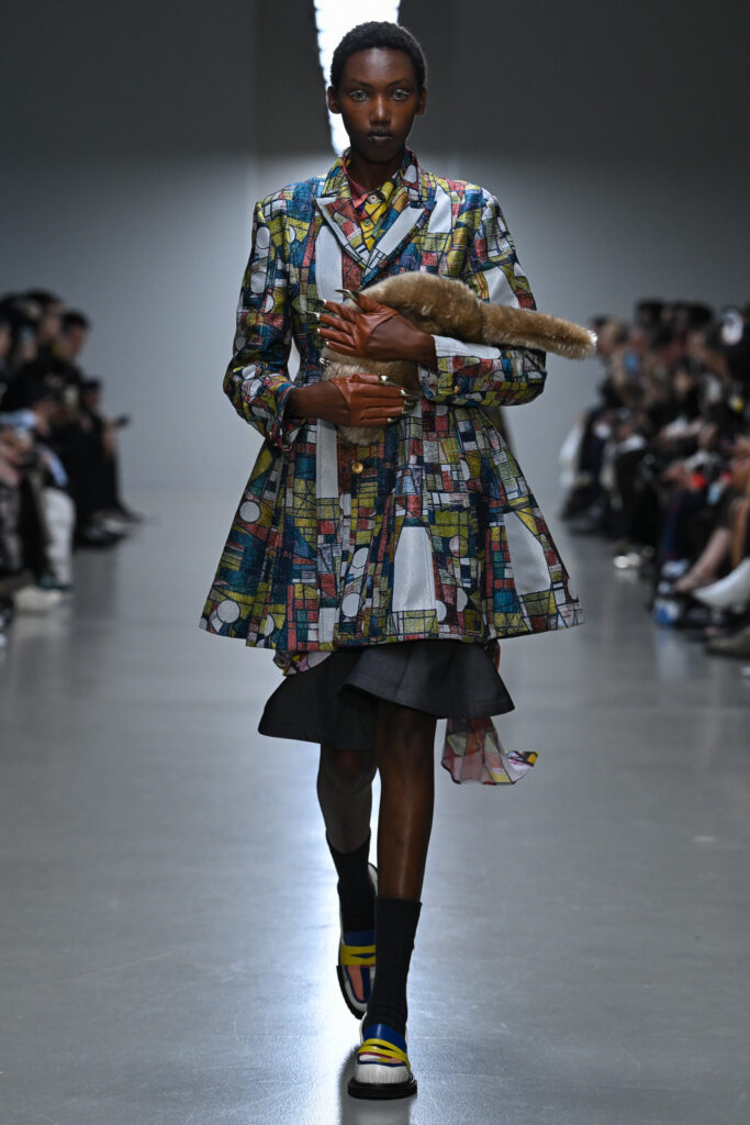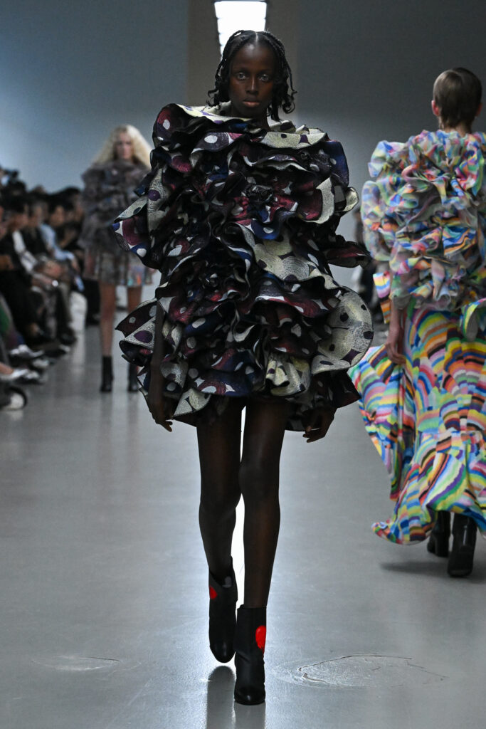 Les silhouettes elles-mêmes semblent animées d’un souffle propre. Des volants câblés évoquent des organismes primitifs ou baroques, difficiles à situer dans une chronologie du vivant. Une robe se gonfle comme un cœur en diastole. Des ourlets ondulent, des capes palpitent. Les accessoires prolongent cette anatomie émotive : des sacs en forme de félins, développés avec la start-up robotique Yukai Engineering à partir du concept Qoobo, battent doucement de la queue comme s’ils ronronnaient en silence.