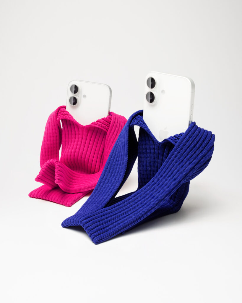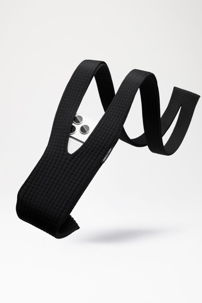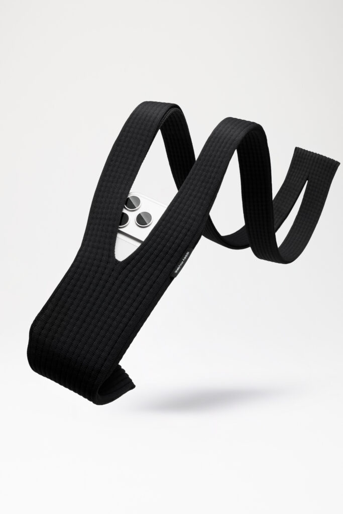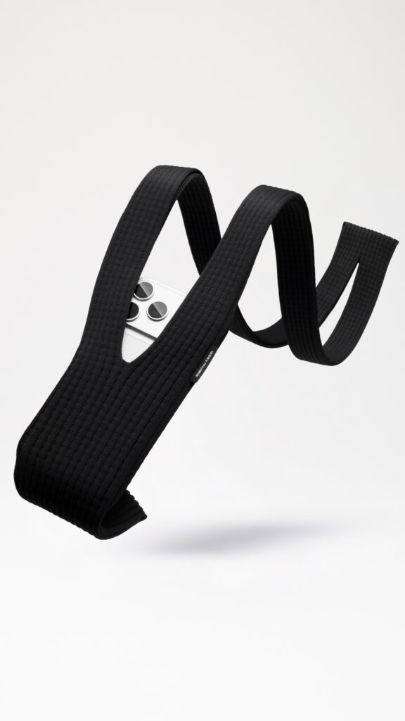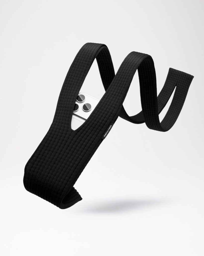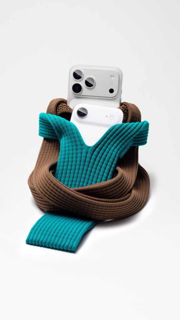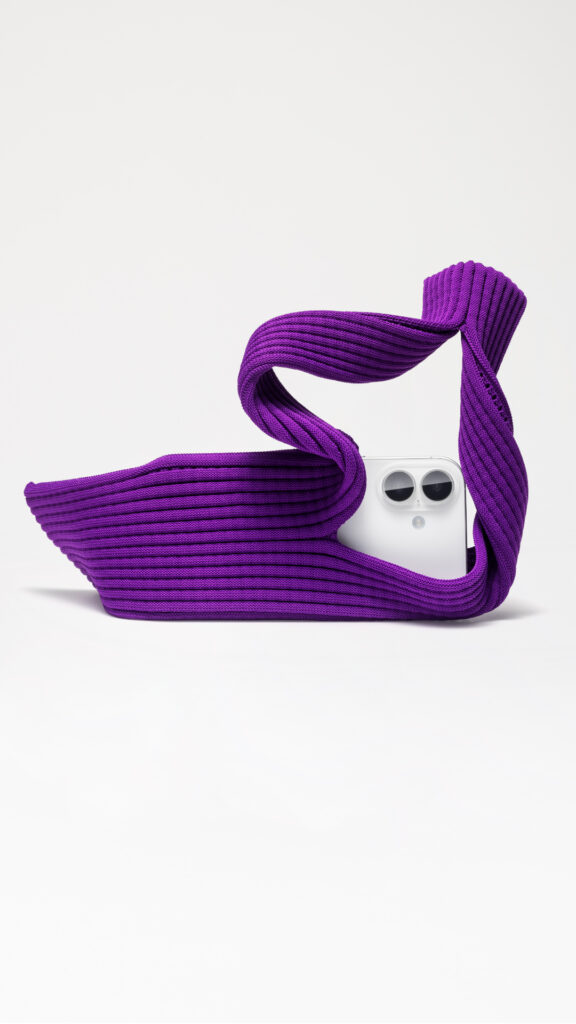 La référence au plissé n’est pas décorative. Elle est structurelle. La maille côtelée évoque les recherches historiques d’Issey Miyake sur le mouvement et la modularité, mais transposées ici à un usage quotidien contemporain : le téléphone, prolongement constant de la main et du regard. L’iPhone Pocket ne cherche pas à effacer cette présence. Au contraire, il l’assume. Le textile ajouré laisse deviner l’écran, les contours, parfois même la couleur de l’appareil. Le contenu n’est jamais dissimulé, simplement accompagné.